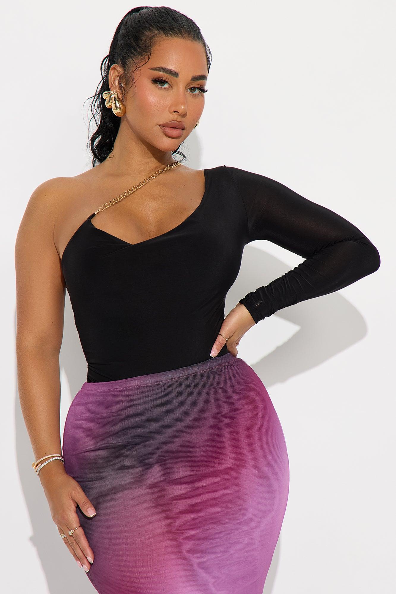 Available In Black And Burgundy. Bodysuit Final Sale One Shoulder Long Sleeve Chain Strap Adjustable Draped Detail Cheeky Bottom Snap Closure Stretch Self : 95% Polyester 5% Spandex Imported California Proposition 65WARNING: Cancer and Reproductive Harm - www.P65Warnings.ca.gov.