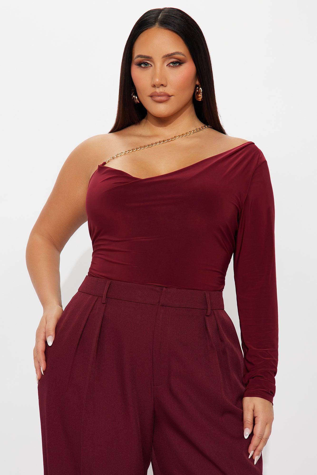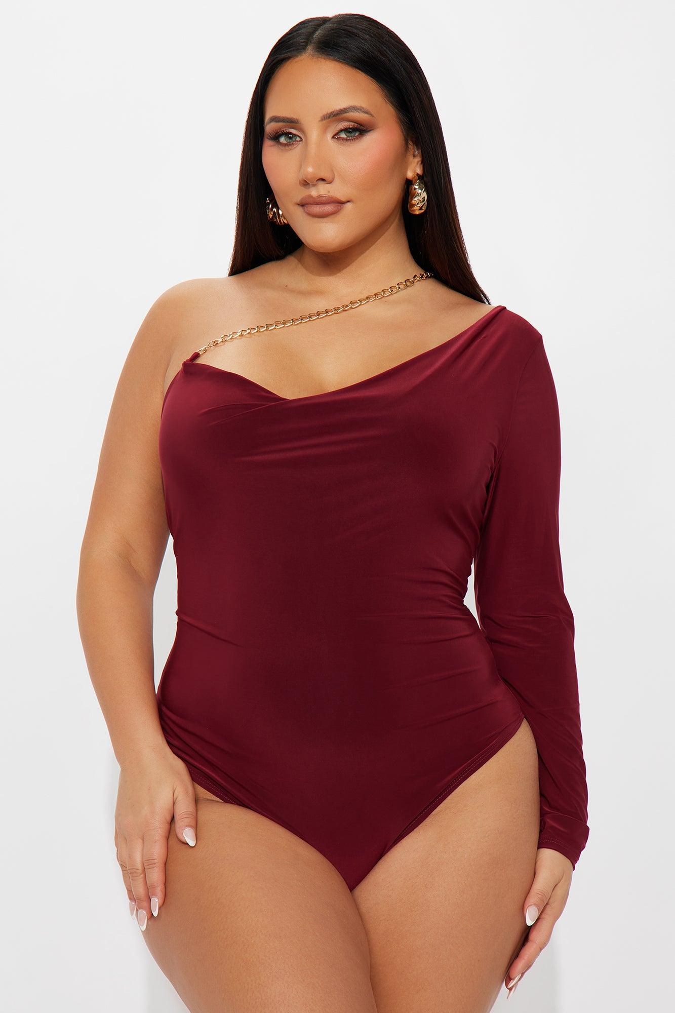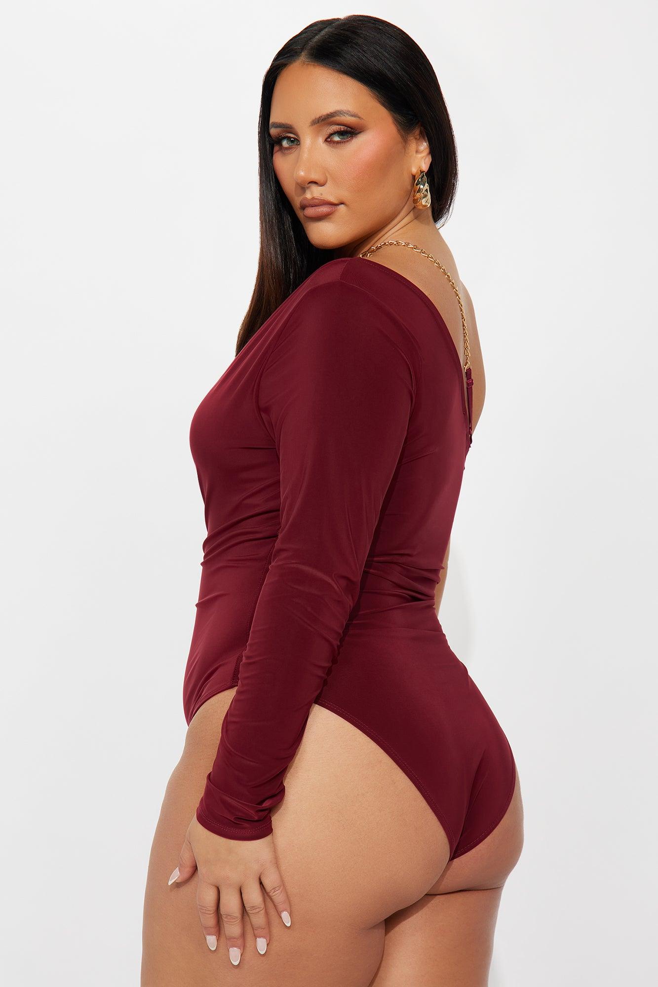 Available In Black And Burgundy. Final Sale Bodysuit One Shoulder Long Sleeve Chain Strap Adjustable Draped Detail Cheeky Bottom Stretch Snap Closure Self : 95% Polyester 5% Spandex Imported California Proposition 65WARNING: Cancer and Reproductive Harm - www.P65Warnings.ca.gov.