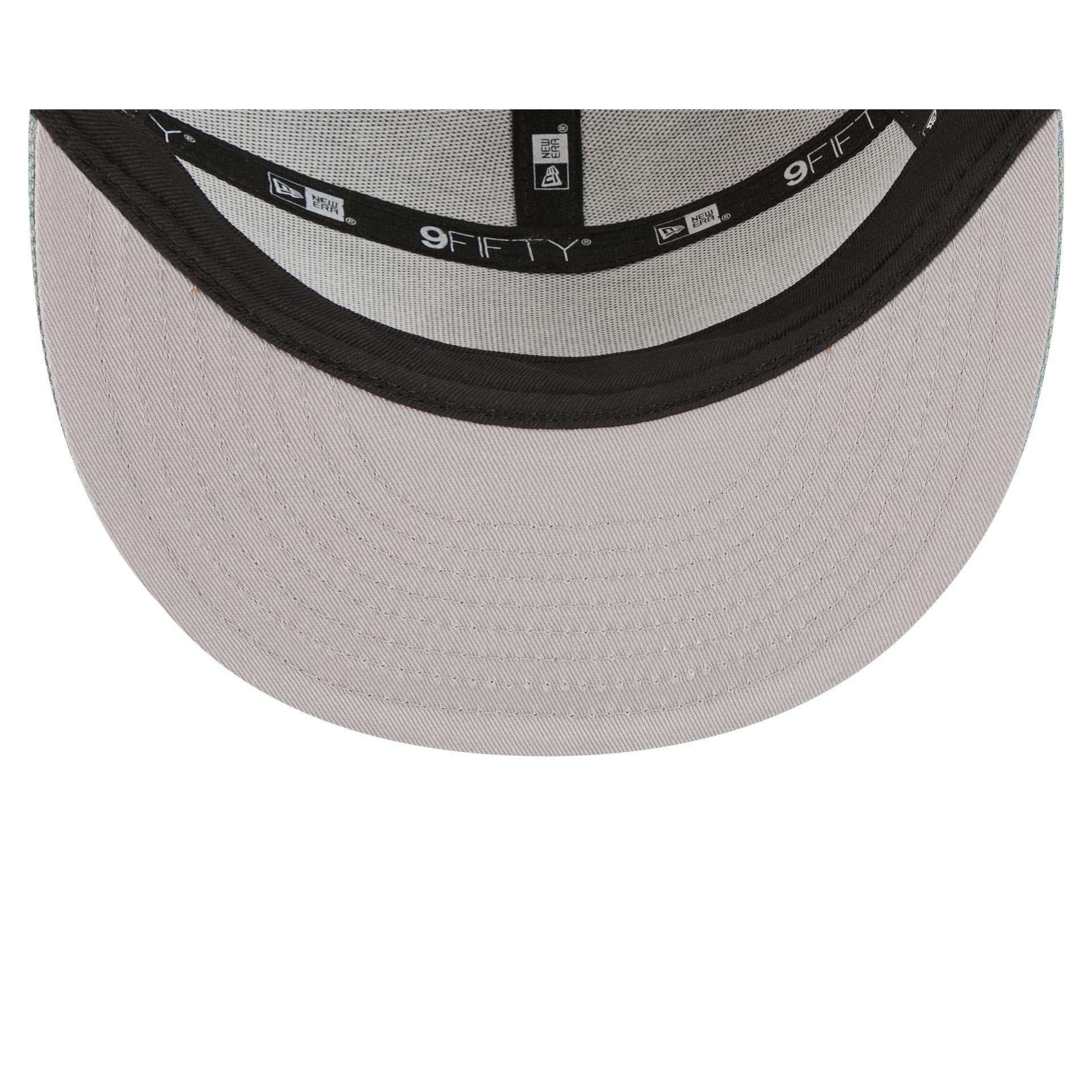 The Notre Dame Fighting Irish Denim 9FIFTY Split Panel Trucker Hat features an embroidered Fighting Irish logo at the front panels with an adjustable snapback closure at a mesh rear.