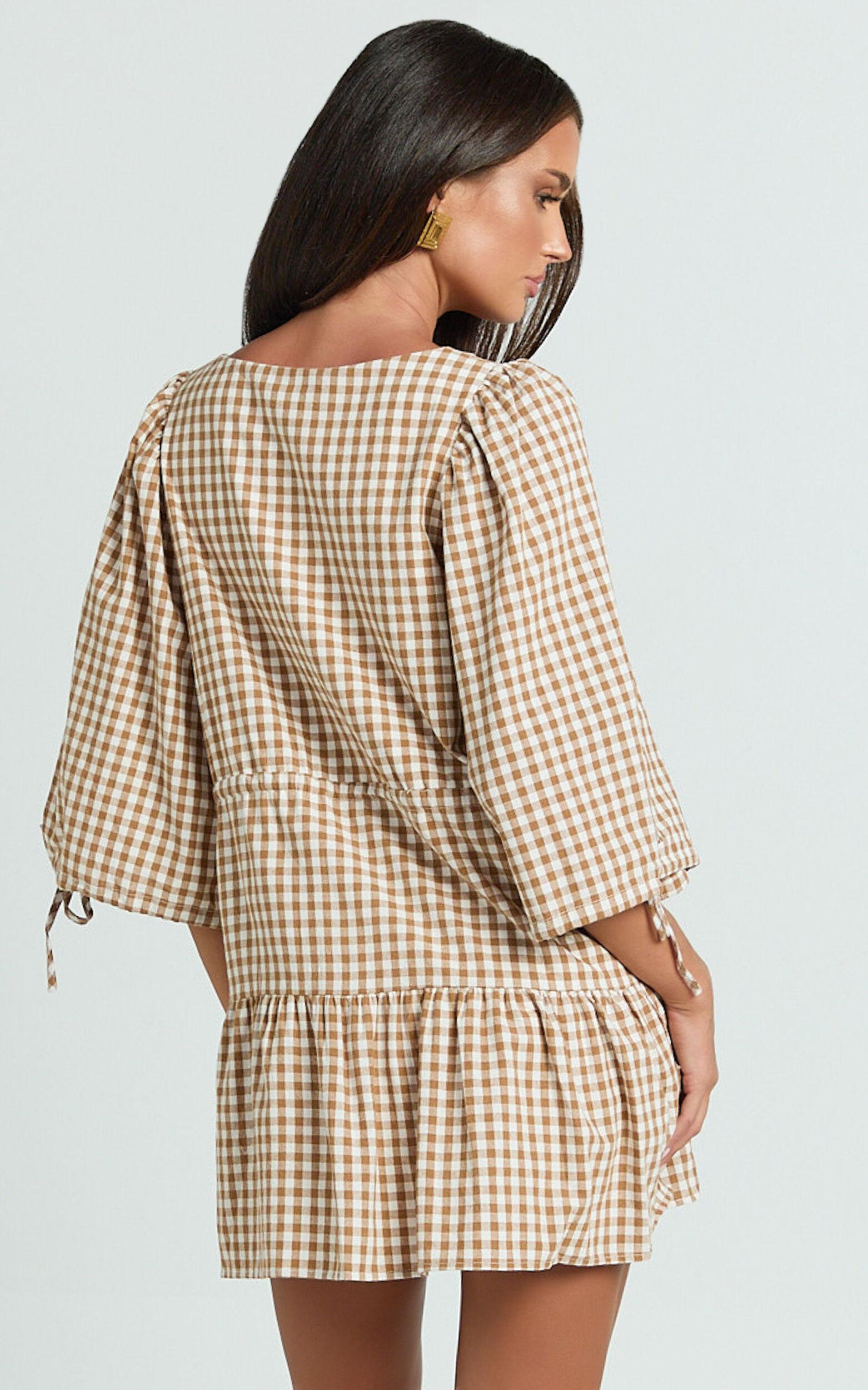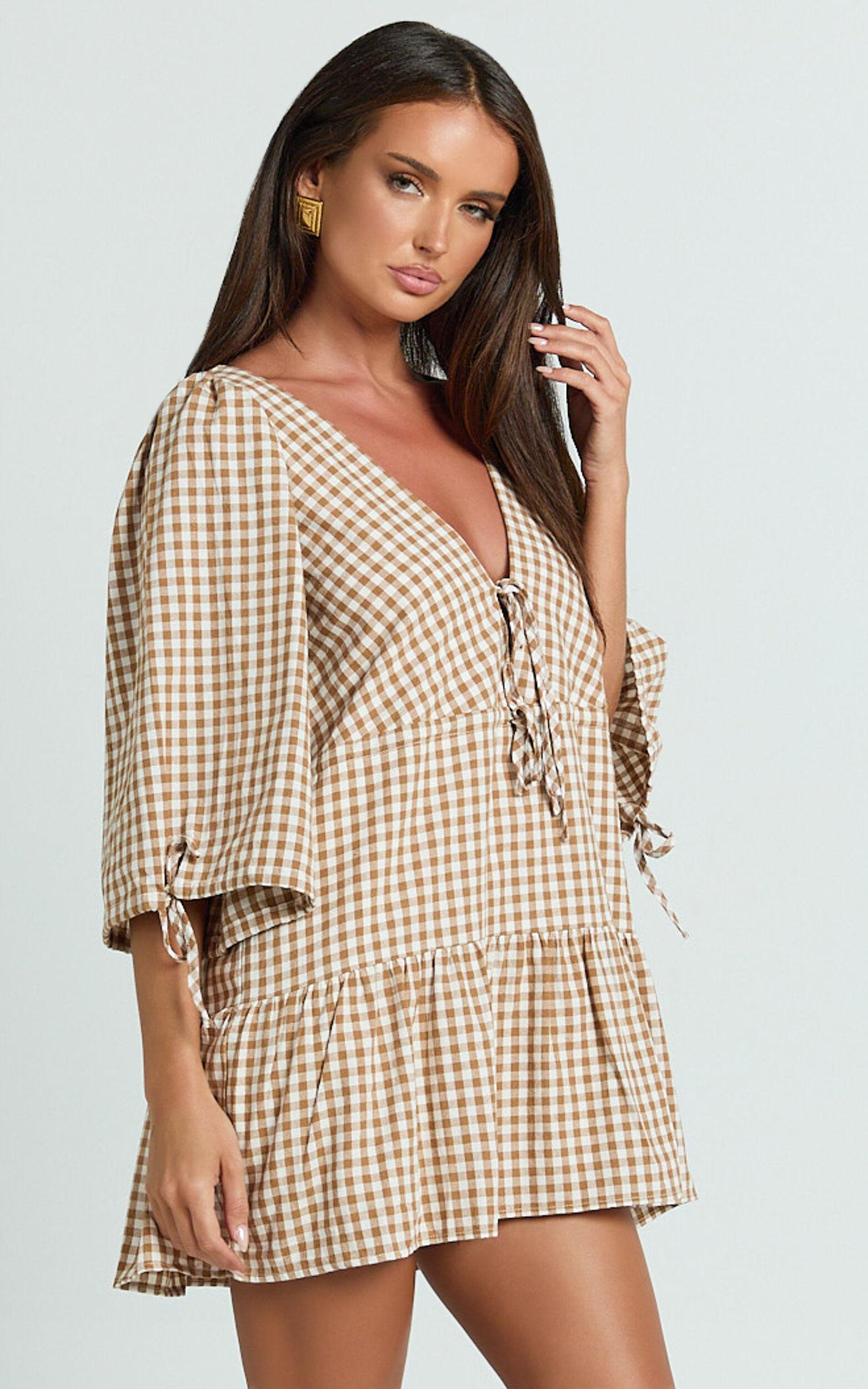 Transform your look with the Nour Mini Dress, a beautifully designed High Neck Tie Front Drop Waist Gathered Skirt Dress that effortlessly combines classic charm with modern flair. Featuring a captivating caramel/white gingham pattern, this dress brings a fresh and vibrant vibe to your wardrobe. Whether you're headed to a casual brunch with friends or an outdoor afternoon event, the Nour Mini Dress is the perfect choice.Product Details:Zips featureInner liningSmock dress styleCotton fabricV neckCasual wearMini length3/4 sleeveSize and FitSize S / 8 length: 80.5cm / 31.69inMaterial and CareMain Fabric: 100% CottonNo StretchNatural FibresThe main fabric of this product is made from 100% Natural Fibres. Whilst some of these fibres still have detrimental impacts in their supply chain, Natural Fibres have a reduced overall impact compared to a raw polyester.
