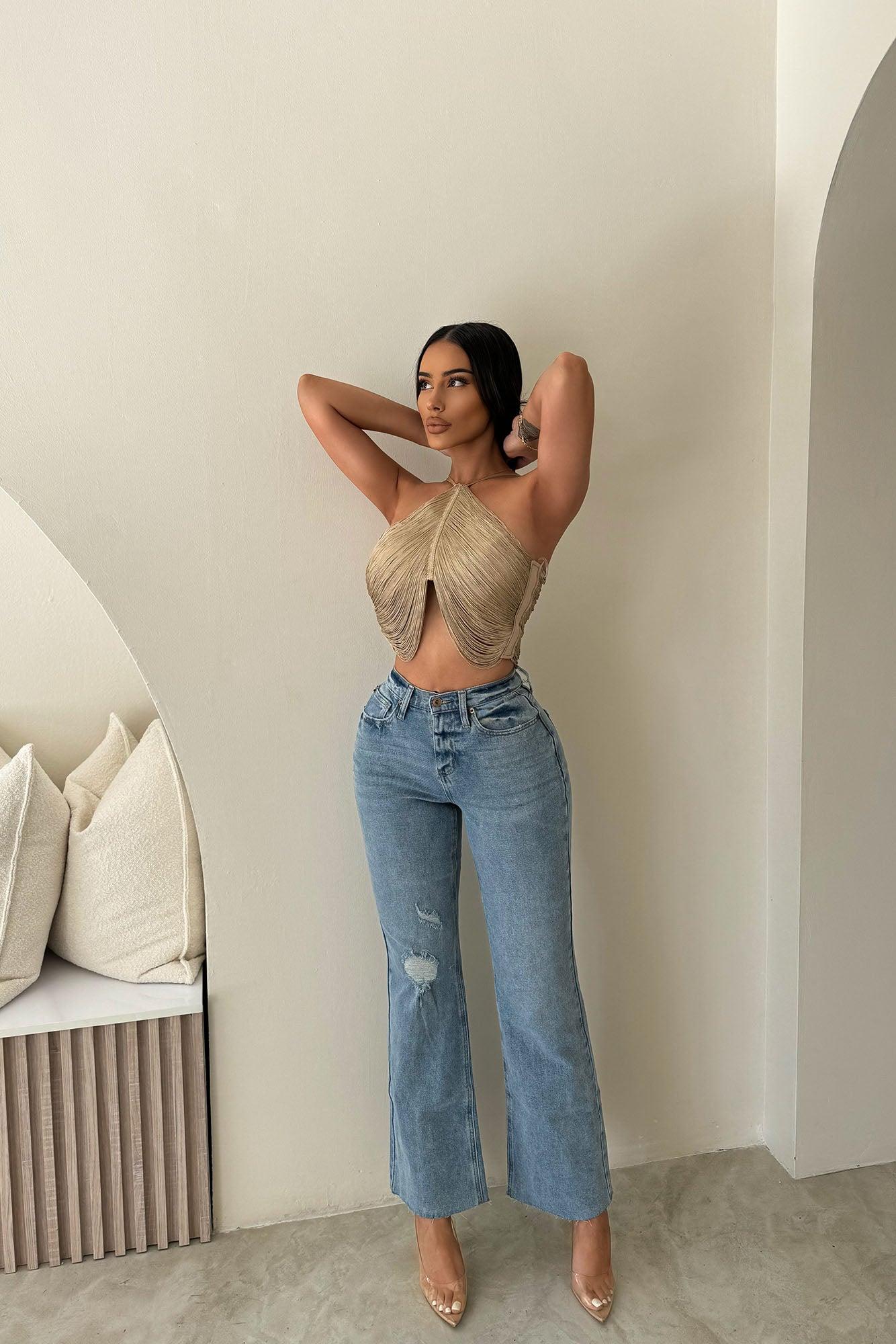 Available In Light Wash. Wide Leg Jeans 11" High Rise 5 Pocket Distressed Raw Cut Hem 32" Inseam Low Stretch Disclaimer: Due To The Specialized Wash & Distressing Process, Each Garment Is Unique. 70% Cotton 28% Polyester 2% Spandex Imported California Proposition 65WARNING: Cancer and Reproductive Harm - www.P65Warnings.ca.gov.
