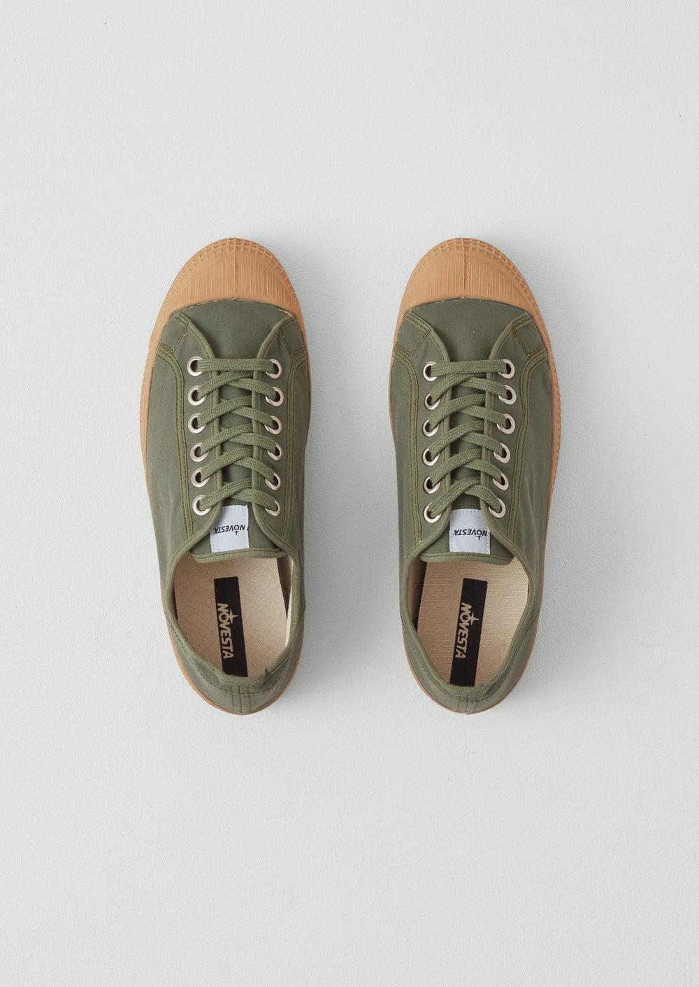 Classic plimsolls from Novesta, crafted from cotton and coated in a water-resistant wax. The signature natural rubber sole is machine-pressed onto the upper and finished with precise manual work to create a tire texture.