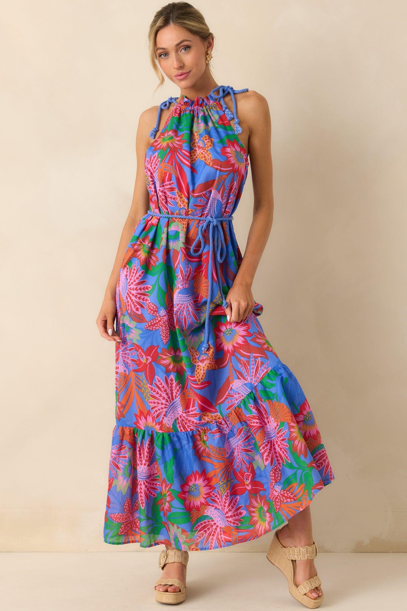 The Nowhere To Be Blue Tropical Floral Cotton Halter Maxi Dress is made for slow days and open plans. Effortlessly vibrant and easygoing, it’s the kind of piece that lets you fully settle into the moment. This blue maxi dress features a pink multicolor tropical print throughout, adjustable self-tie halter neckline, blue nautical-inspired rope ties on each shoulder, ruffle trim detailing, optional blue self-tie rope belt, and functional pockets.