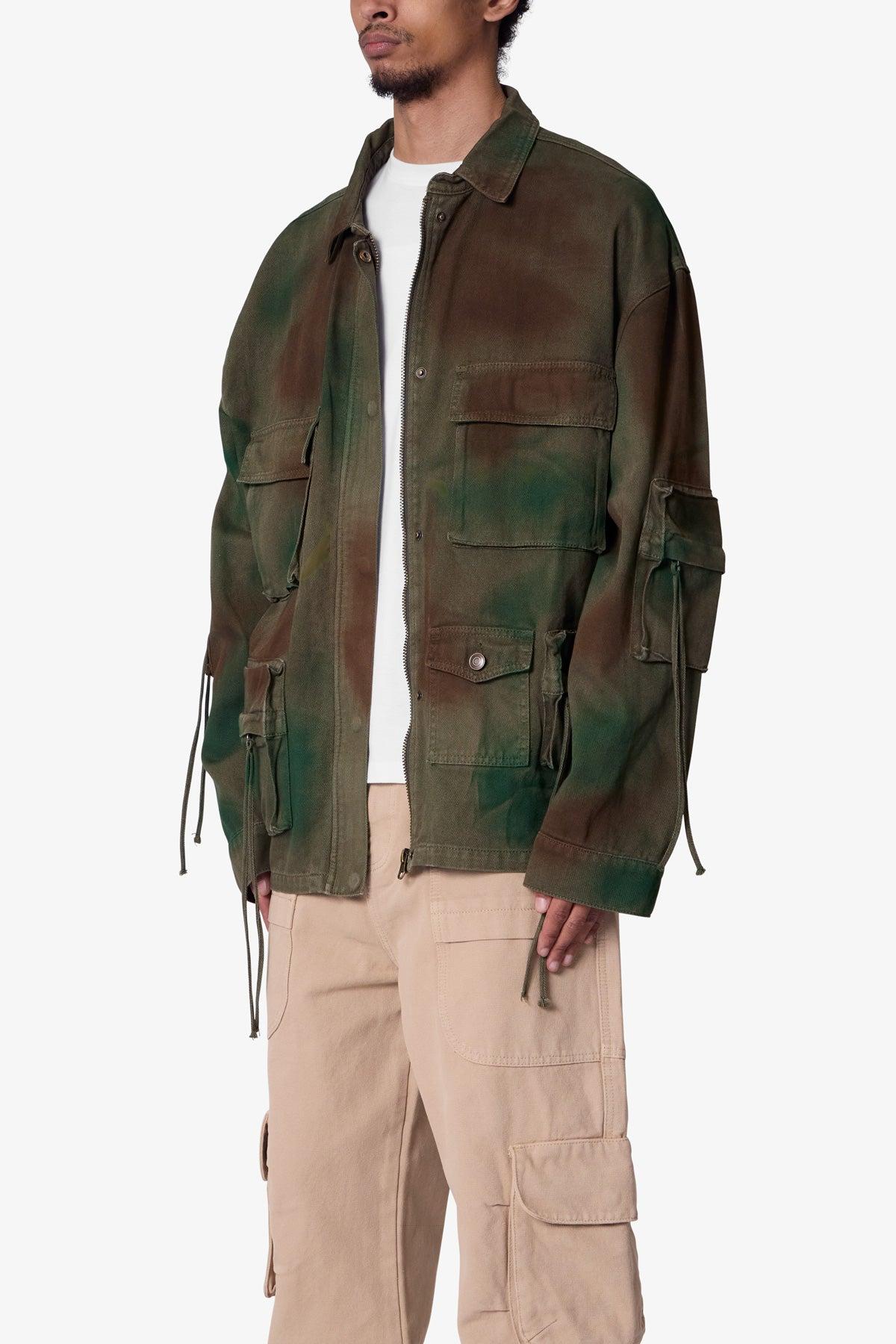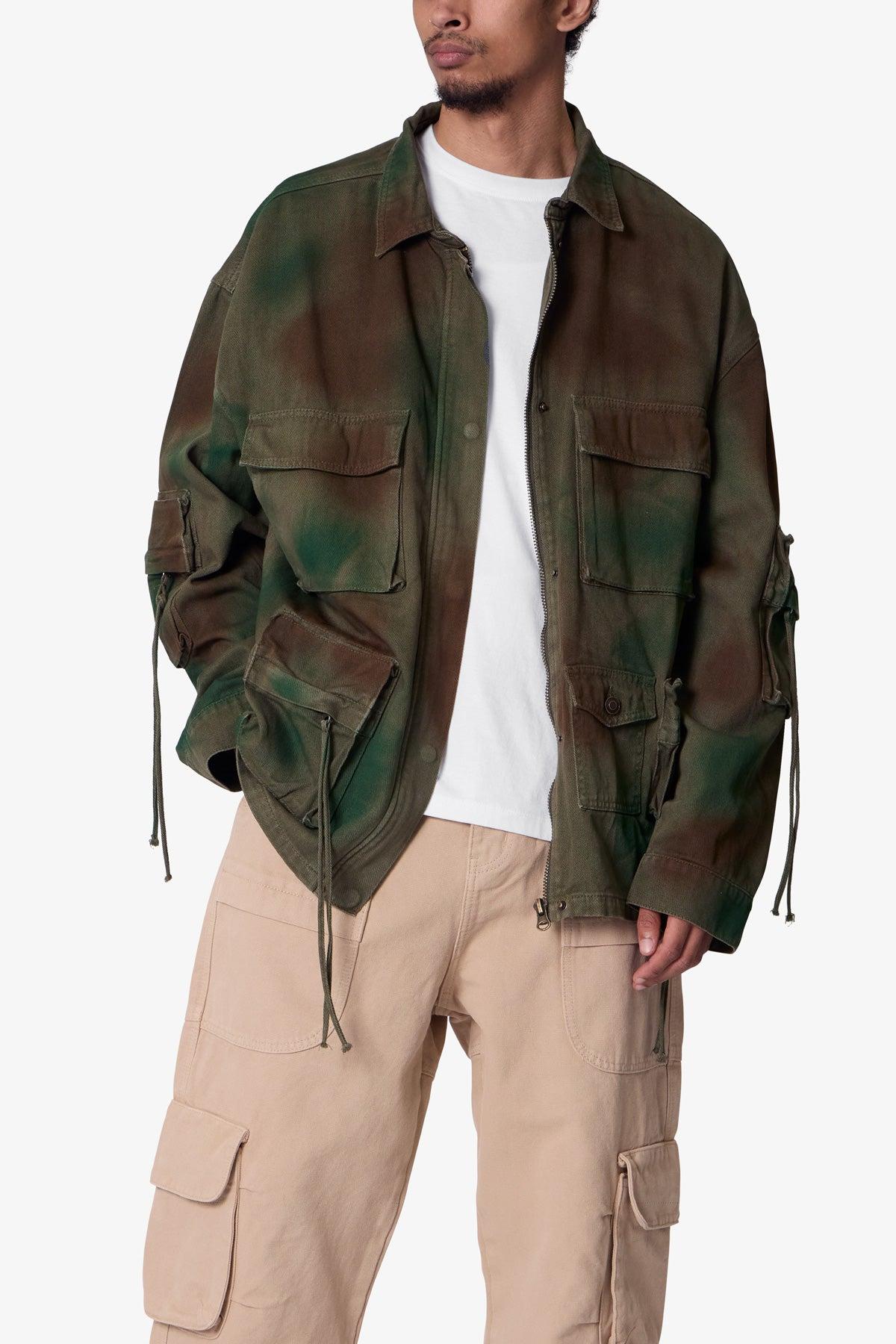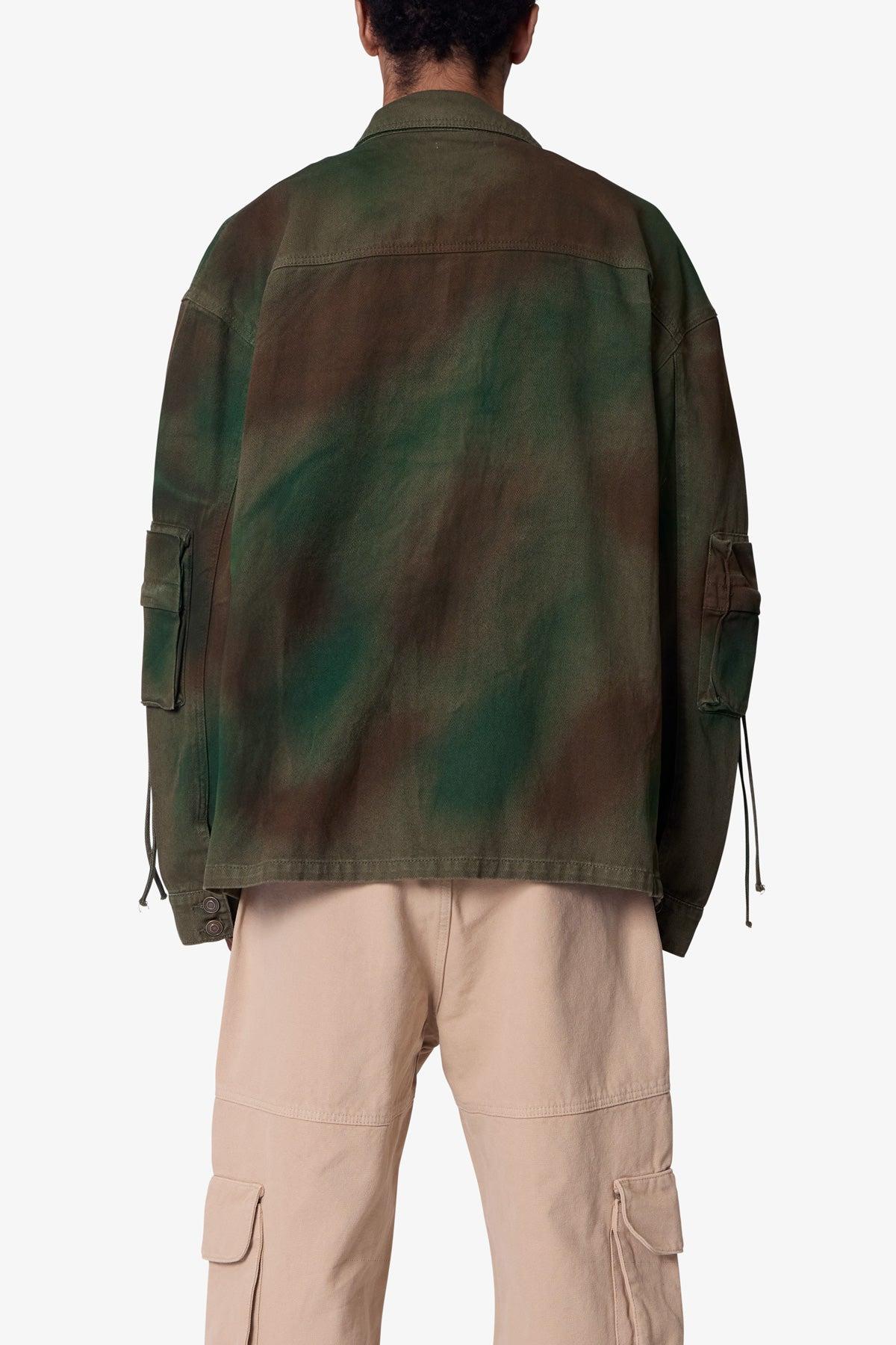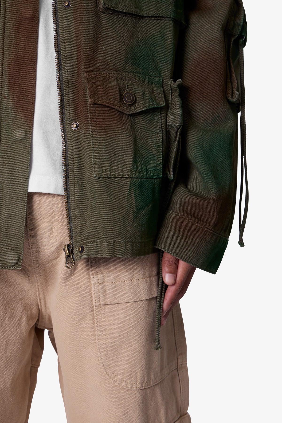 the NR10 Jacket is designed with a relaxed fit and featuring a zipper and snap placket and pockets throughout the front and sleeves. The heavy olive twill base undergoes a vintage wash with a sprayed camo pattern throughout, that’s both visually striking and pleasing to the touch. Details relaxed fit 100% cotton Model