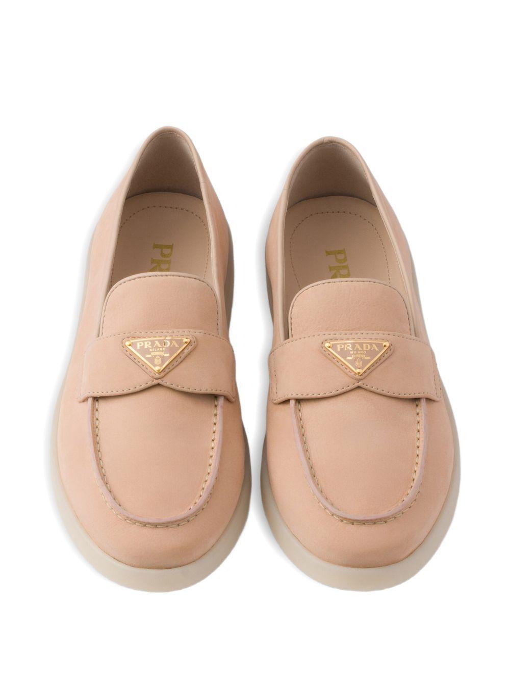Prada nubuck loafers | Pink | These nubuck leather loafers with classic allure are characterized by the pinched stitch seams on the upper. The enameled metal triangle logo stands out on the front. | upper with leather band | apron with pinched stitch seam | leather lining | enameled metal triangle logo | rubber sole, 25 mm | removable leather-covered insole | CALFSKIN/Calf Leather/Rubber | Loafers | Shoes | Women