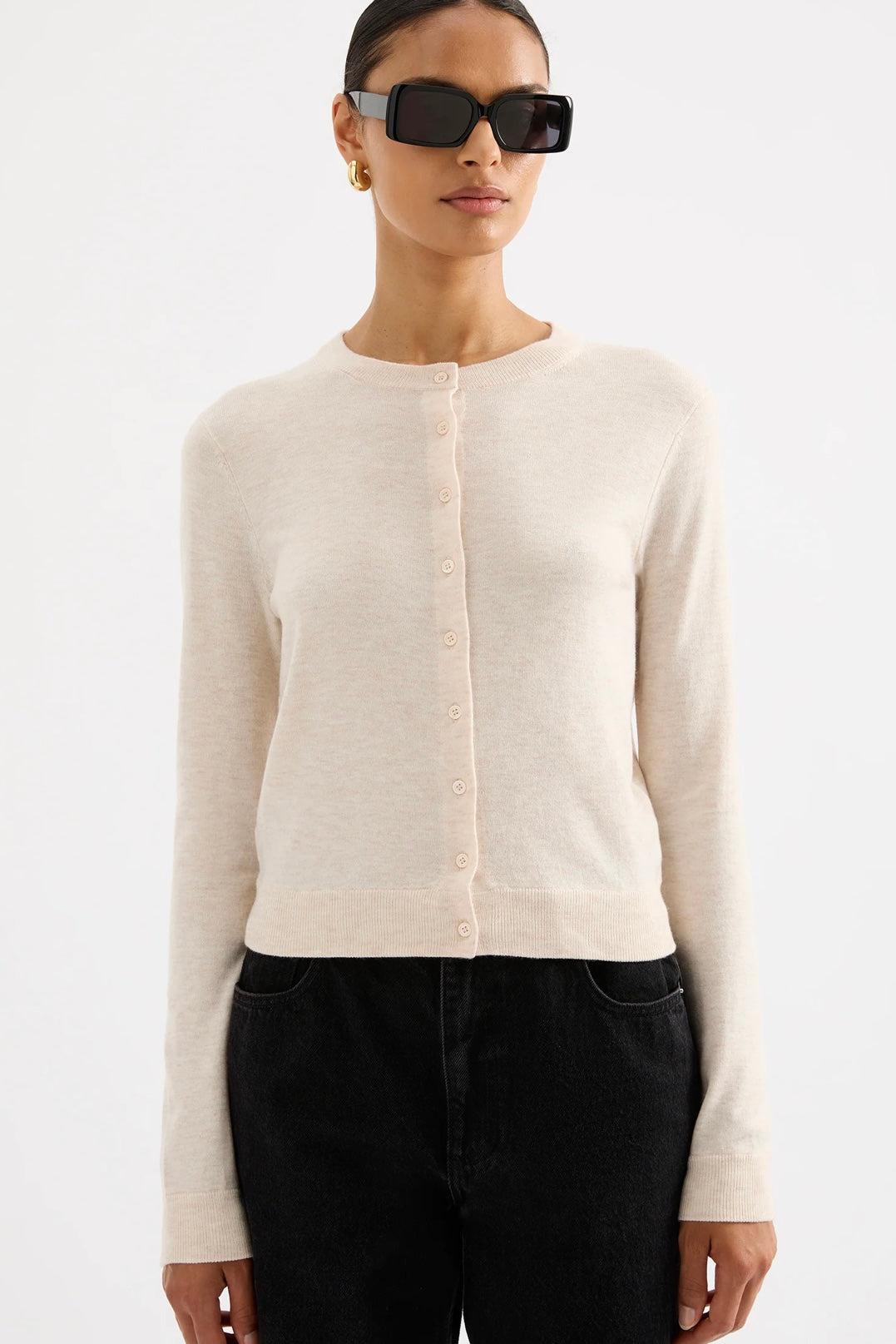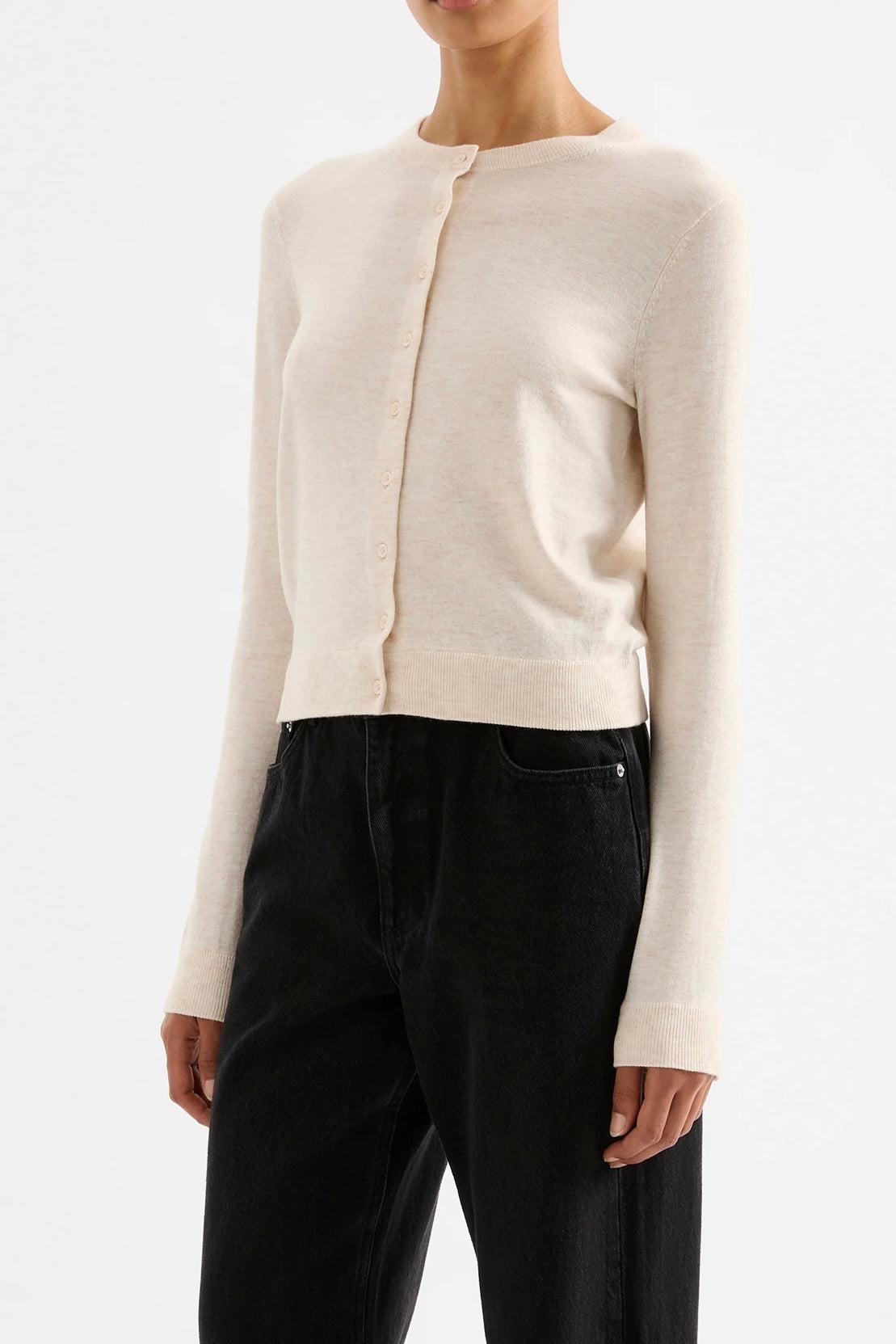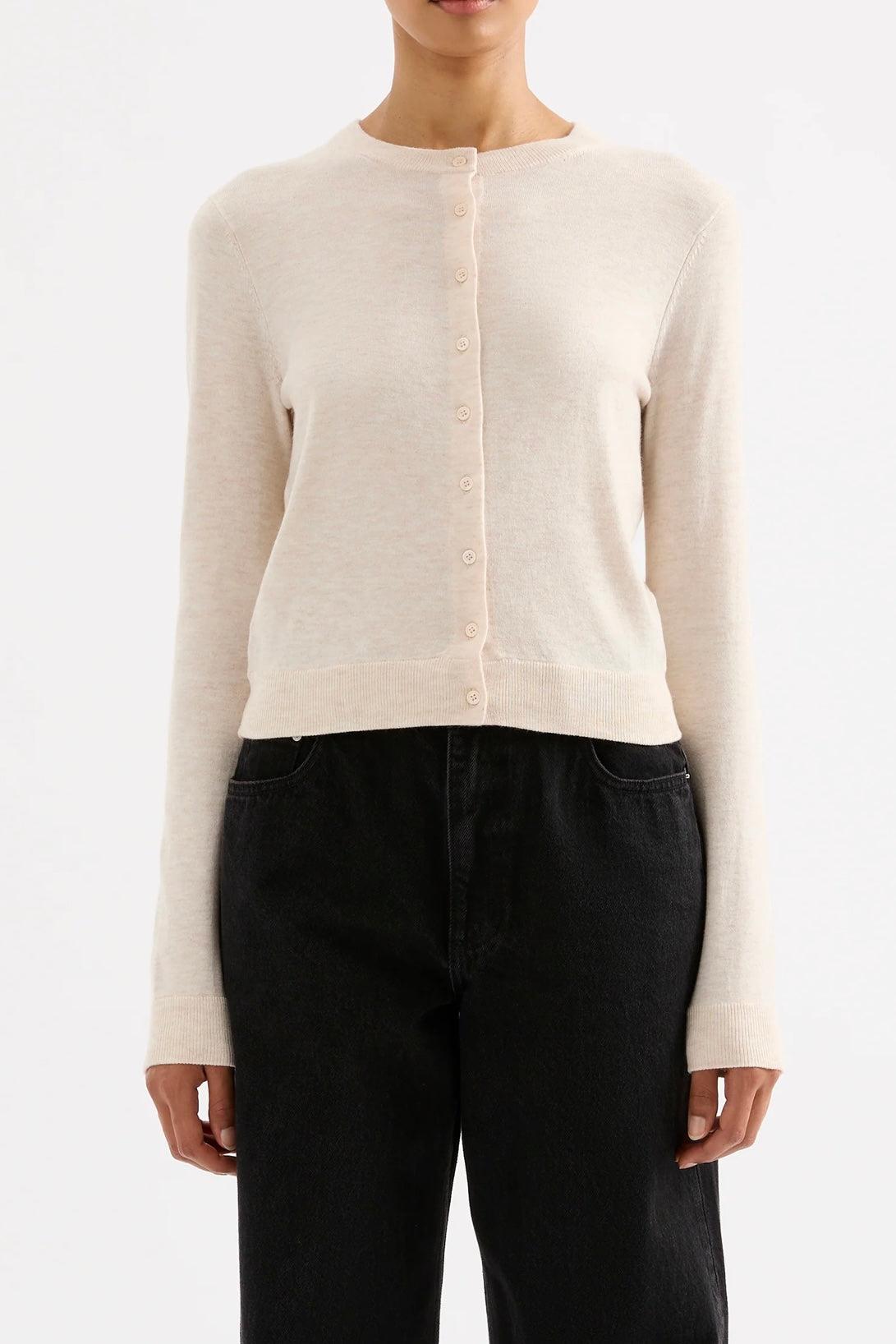 The Rae Knit Cardigan is made from a lightweight yarn with a subtle marle and soft handfeel. The silhouette is a relaxed crew neck cardigan finishing at hip length. Features include centre front button opening and soft rib neckline, cuffs and hem.