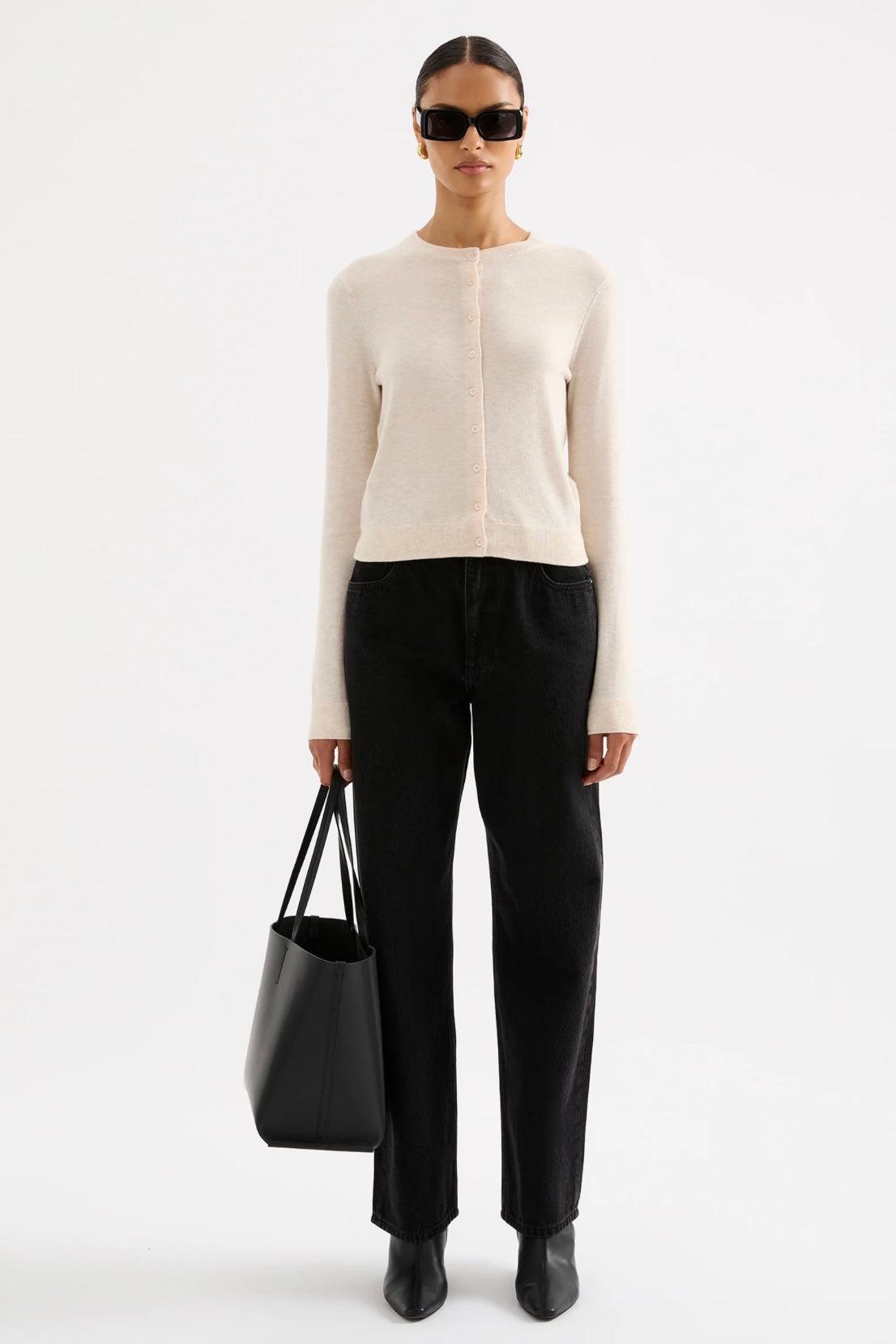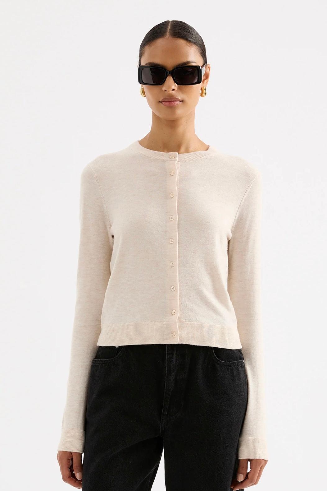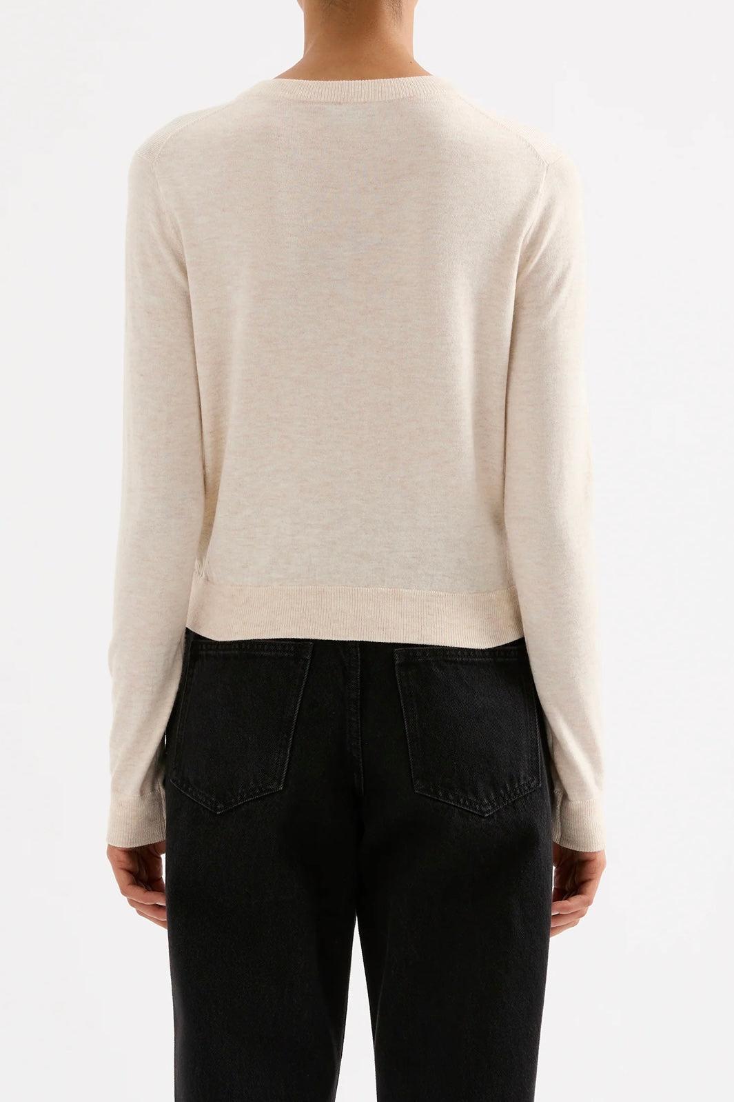 The Rae Knit Cardigan is made from a lightweight yarn with a subtle marle and soft handfeel. The silhouette is a relaxed crew neck cardigan finishing at hip length. Features include centre front button opening and soft rib neckline, cuffs and hem.
