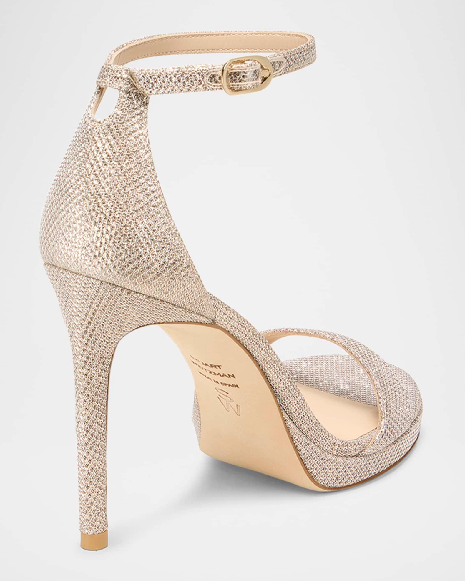 Stuart Weitzman "Nudist" metallic cotton/polyester platform sandals 4.00 in / 100 mm stiletto heel; 0.50 in / 15 mm platform Open toe Adjustable ankle strap Professional cleaning recommended Made in Spain Shipping Direct from Vendor, usually ships within 30 business days.
