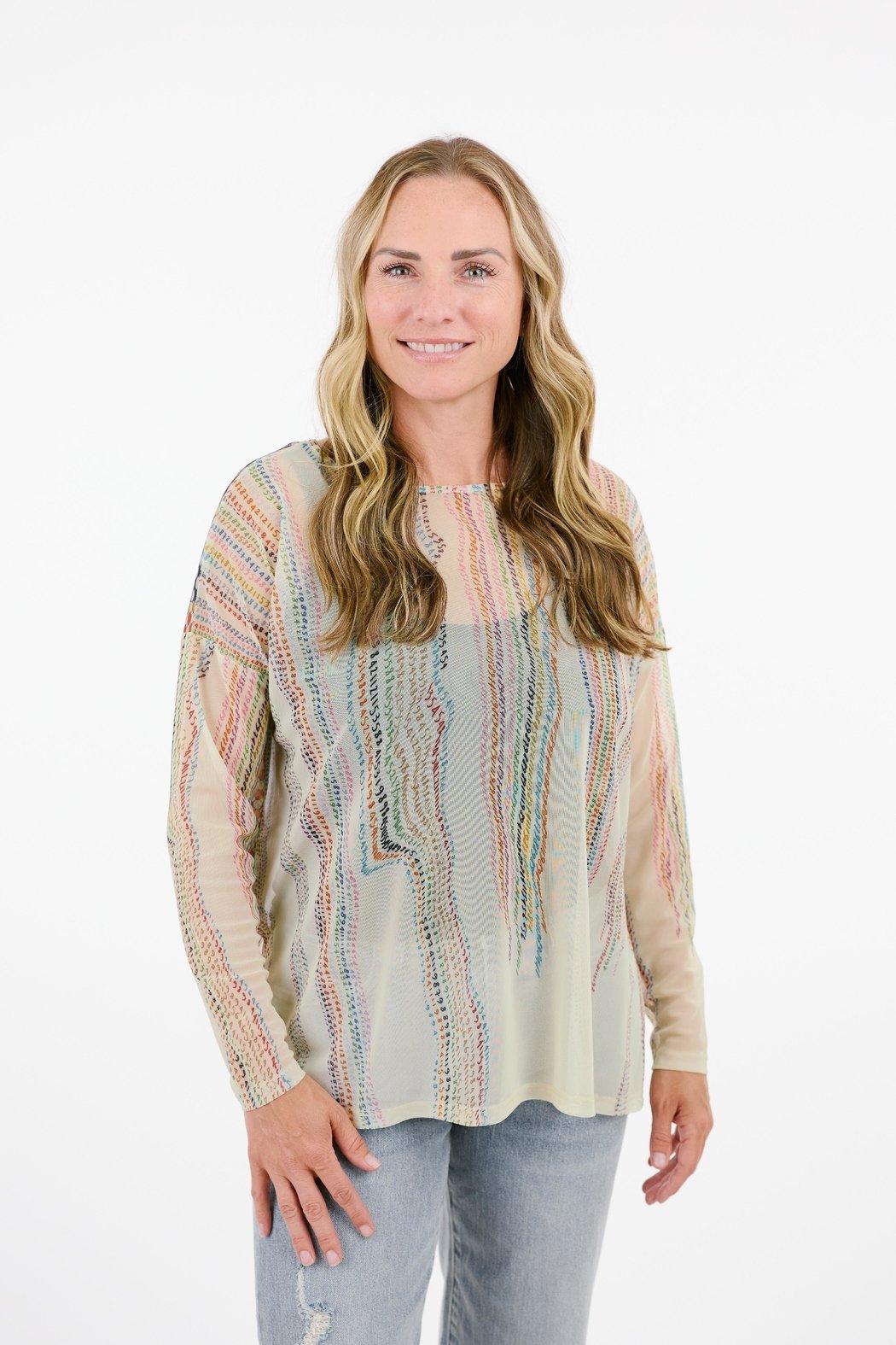 Shannon Passero - artisan made pieces that enrich the lives of the makers! Made in Canada, US, Turkey and Thailand with a thoughtful focus on a minimal environmental footprint. This top features a round neck, drop shoulder long sleeves and a relaxed cut. Made from soft and textural bubble crepe and mesh.