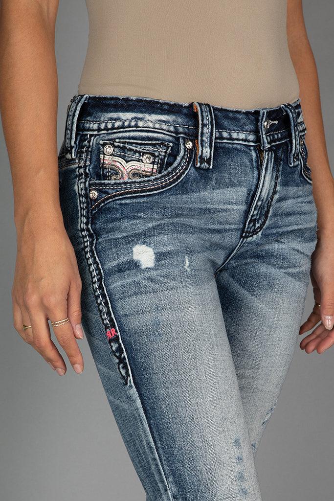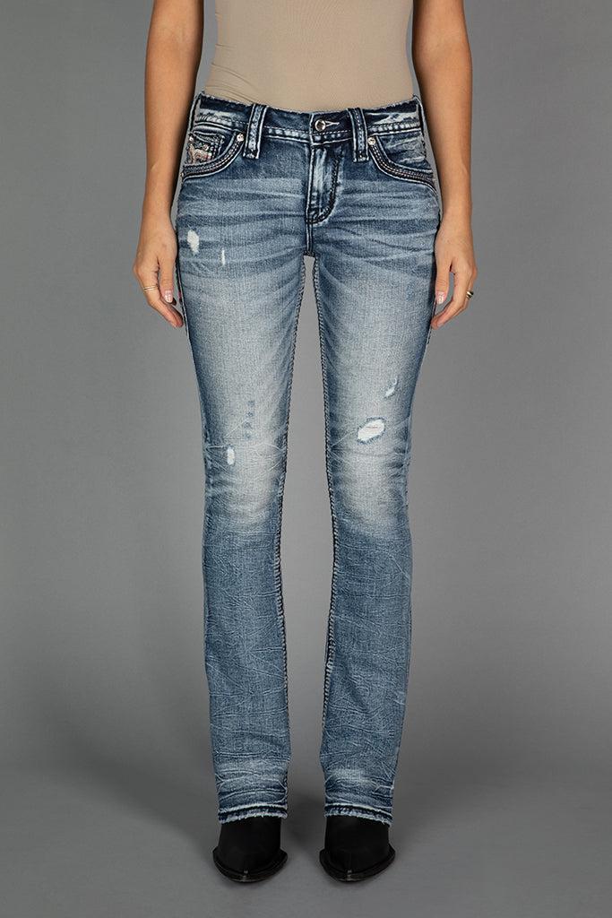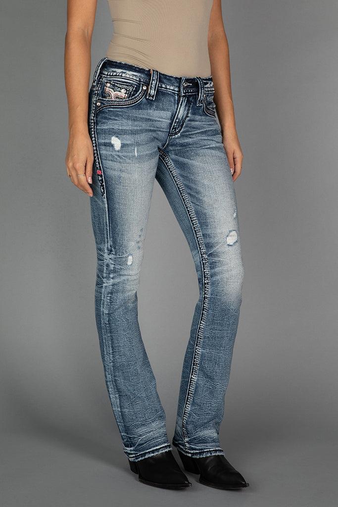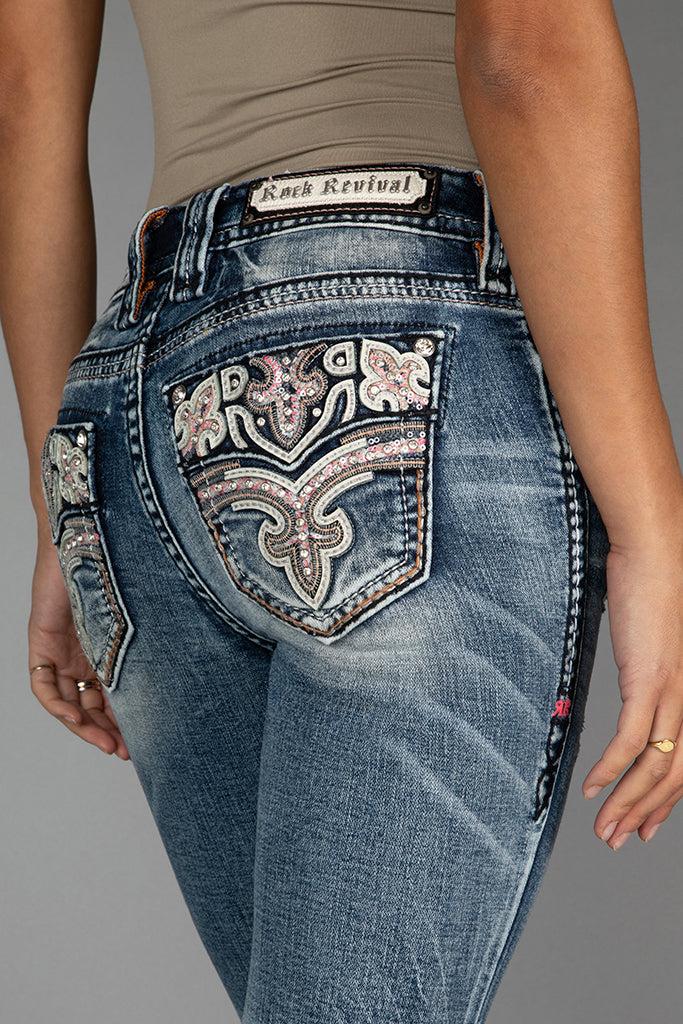 Nuri Bootcut Jeans by Rock Revival with a bootcut silhouette crafted in a medium wash, designed in Los Angeles. Premium stretch denim for comfort and durability Signature inverted Fleur-de-Lis embroidery Custom pewter hardware and rivets Engraved 'Rock Revival' leather waist patch