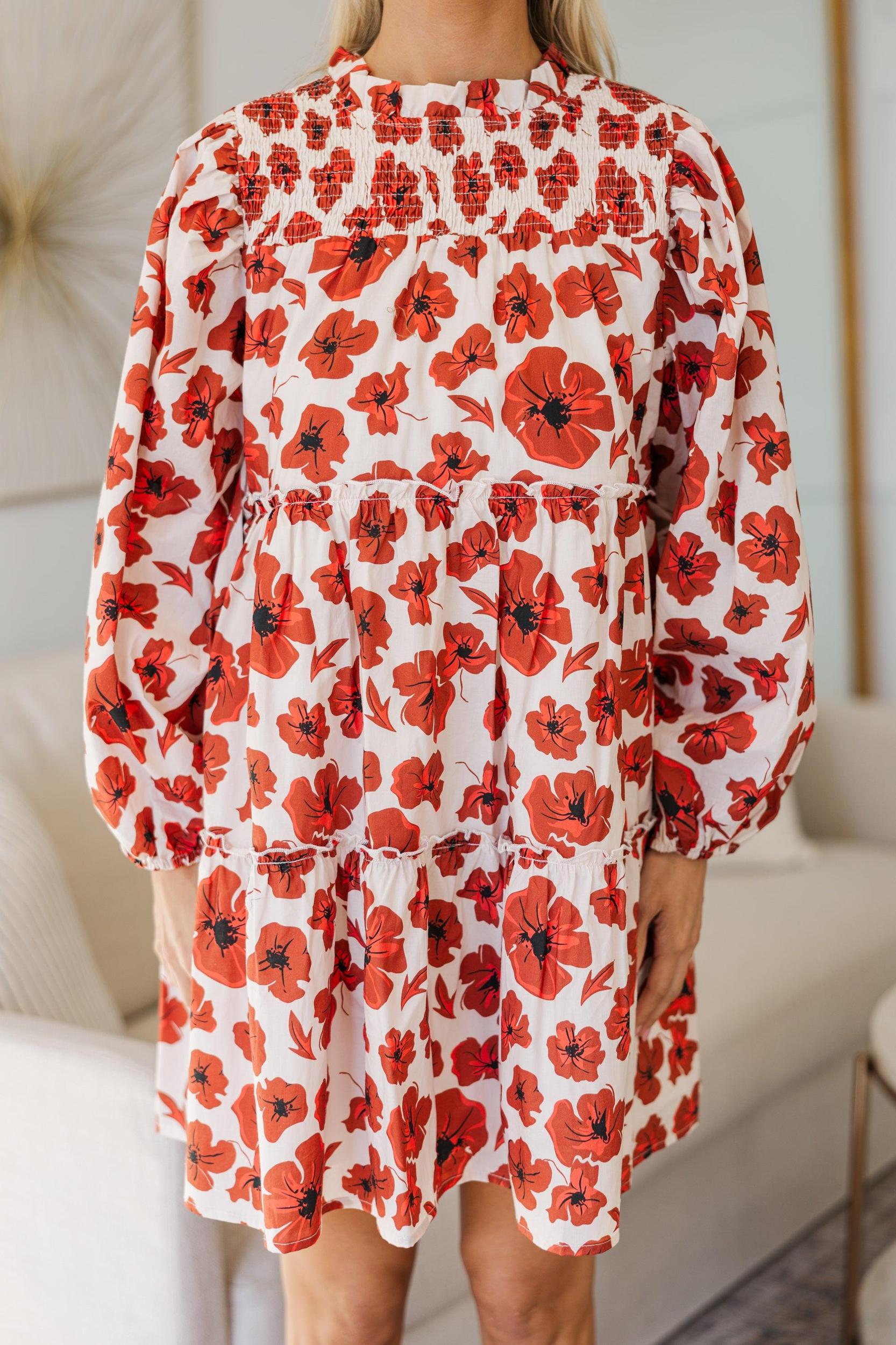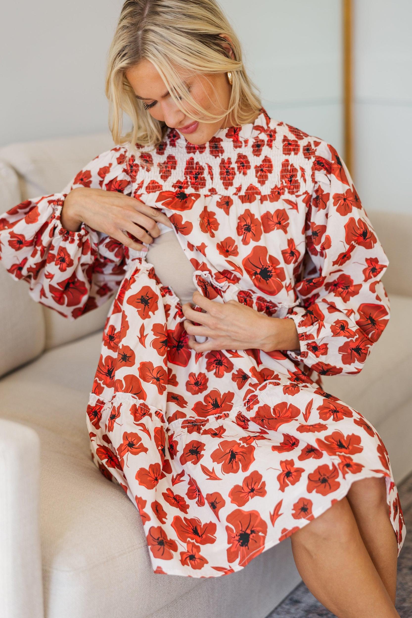 This floral dress will help you be your best every time you wear it! It's so cute while also being a function dress to nurse in! This dress is going to look great this fall with booties or heels! Round neckline Hidden zipper under the bust that can unzip all the way across from either side Button keyhole back Long bubble sleeves Tiered babydoll fit Floral print No stretch Baileigh is wearing the small.