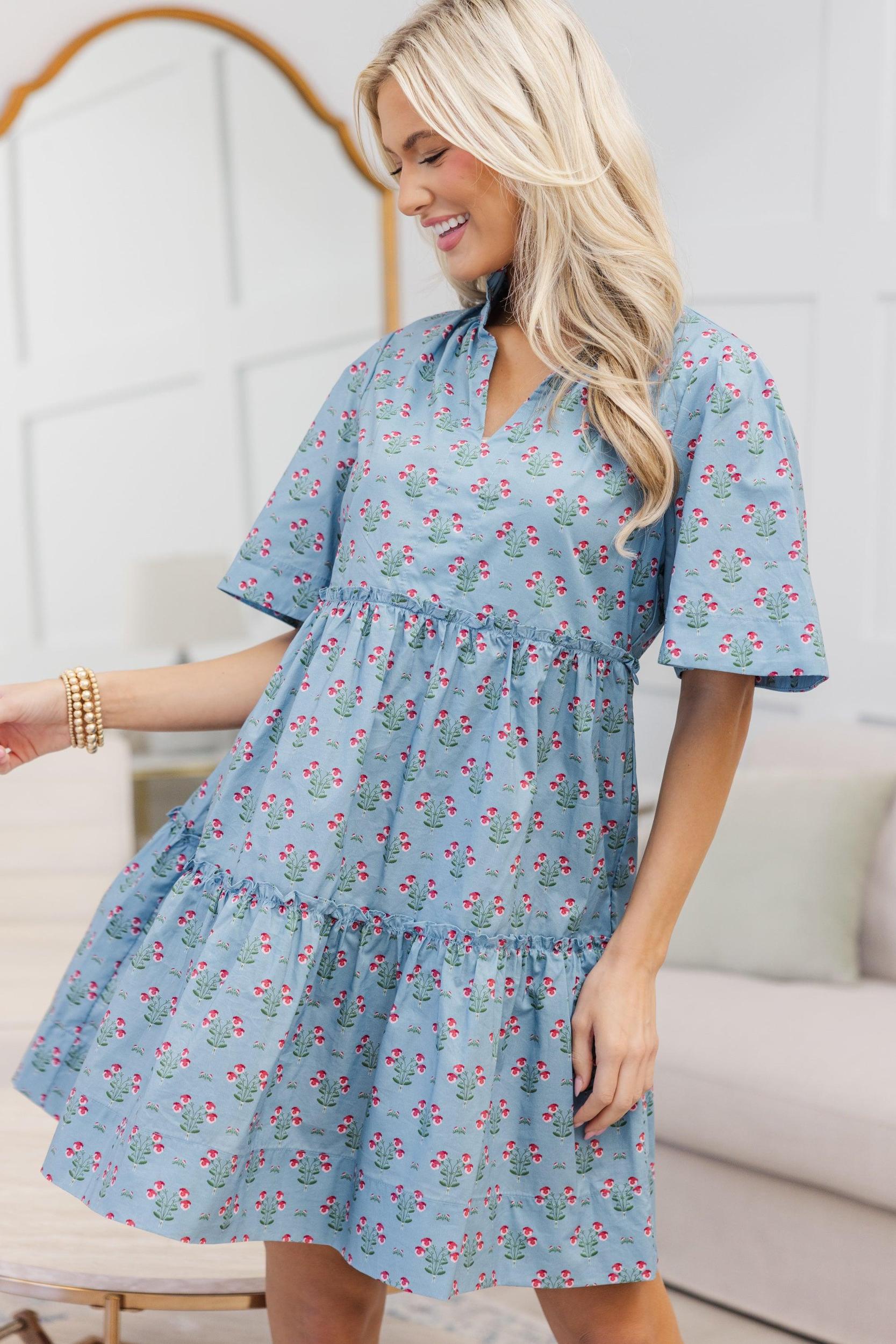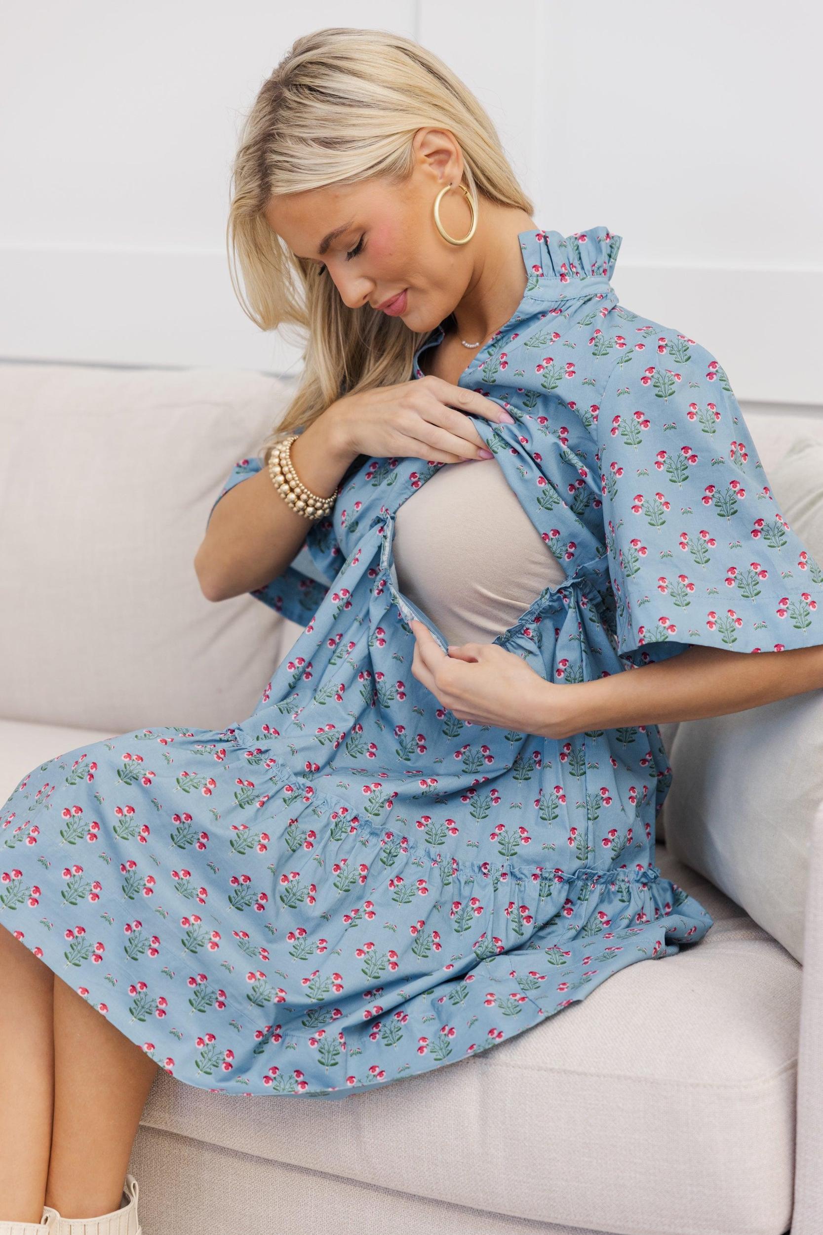 This fab dress will have you feeling your best while being super functional during this phase of your life! That hidden zipper under the bust makes nursing so easy! That print and those colors are absolutely fabulous together! Plus, we all love a babydoll cut! It's just such a comfy fit. V-neckline Hidden zipper under the bust that can unzip all the way across from either side Short sleeves Paisley floral print Tiered body No stretch Baileigh is wearing the small.