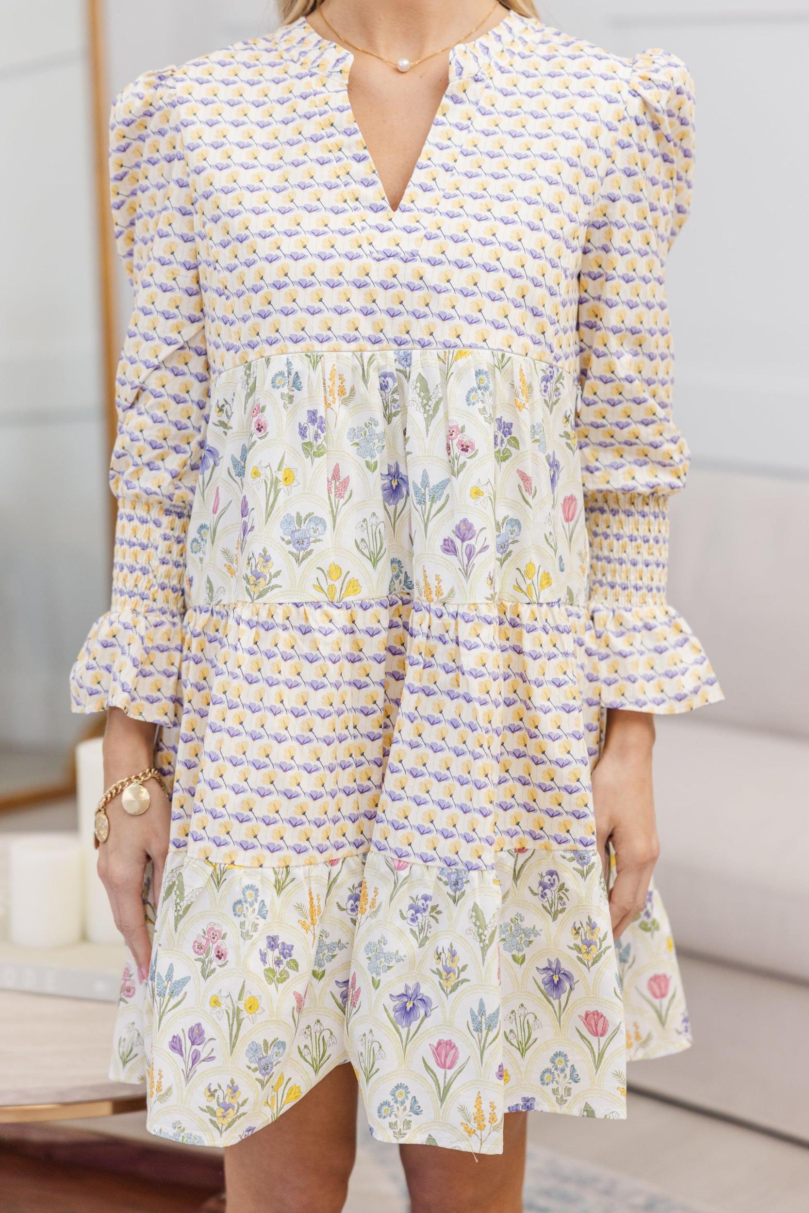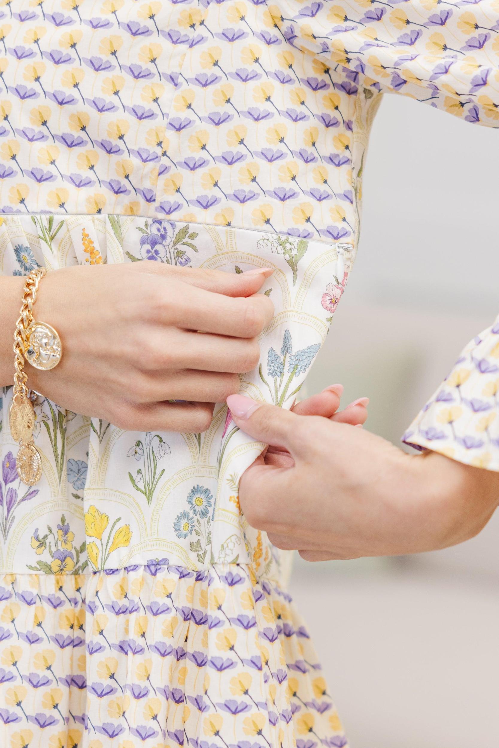 This dress is so cute and, better yet, functional! We love that flowy tiered body and that easy access zipper under the bust. Plus, we love that you can style this dress with heels, boots, or sneaker for any occasion! V-neckline Hidden zipper under the bust that can unzip all the way across from either side 3/4 flounce sleeves Tiered body Floral print No stretch Baileigh is wearing the small.