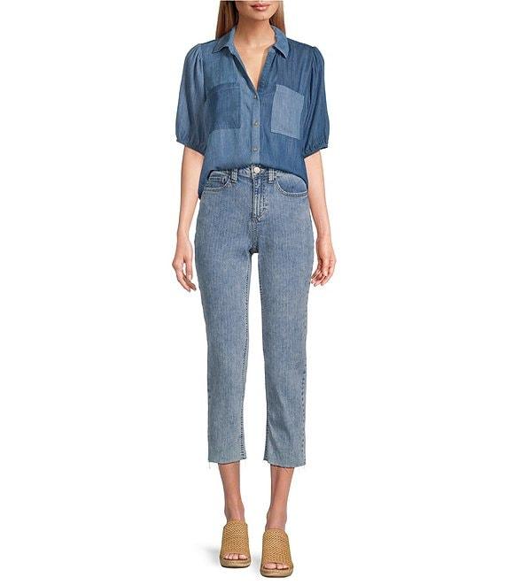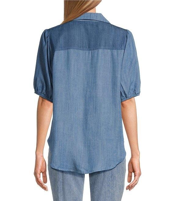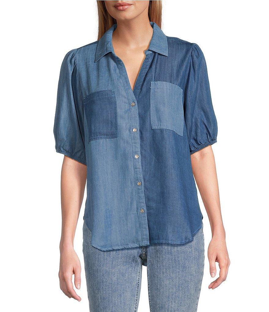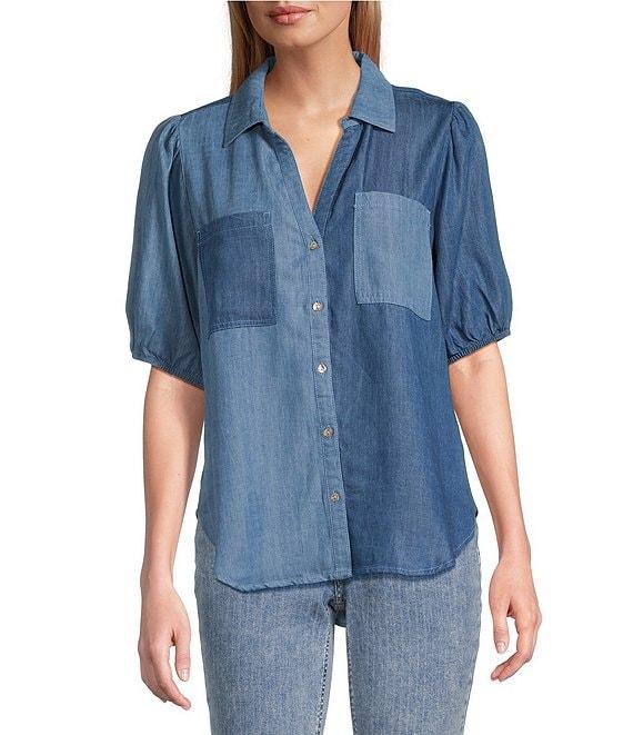 Nurture by Westbound Woven Mixed Wash Button Front Elbow Puff Sleeve Top