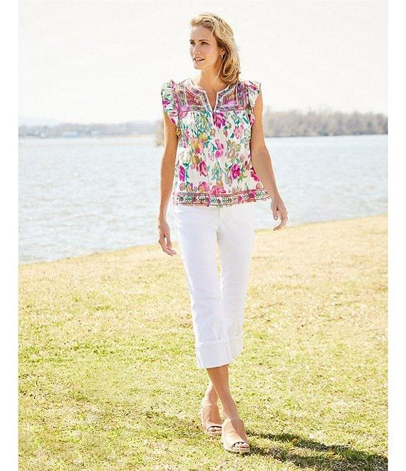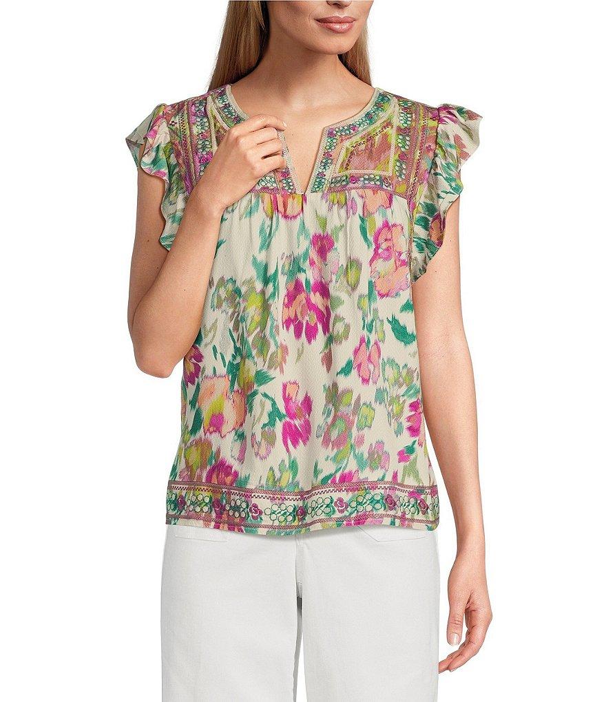 Nurture Embroidered Floral Ikat Print Flutter Sleeve Top