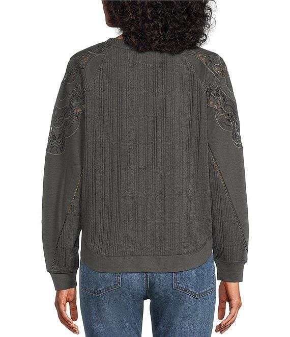 From Nurture Petite, this top features: Crew neckline Long sleeves Mixed media Embroidered lace applique Polyester/spandex Machine wash/tumble dry Imported.