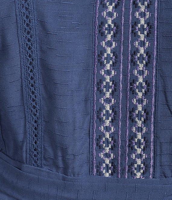 From Nurture Plus, this dress features: V-neckline 3/4 sleeves Belted detail Embroidery and trim details Midi length Approx. 50" length Rayon Machine wash/tumble dry Imported.