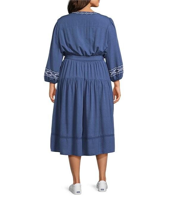 Nurture Plus Size Embroidered 3/4 Sleeve Belted Midi Dress