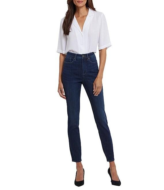 From NYDJ, these jeans feature: Stretch denim fabrication Belt loops High rise 5 pockets style Skinny legs Ankle length Front button and zipper closure Approx. 29" inseam, 10.5" leg opening Cotton/viscose/modal/polyester/elastane Machine wash Imported.