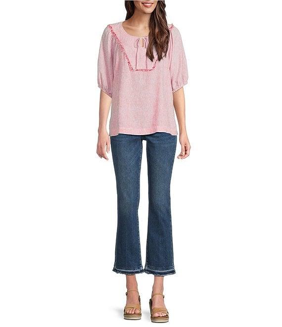 From NYDJ, these jeans feature: Denim fabrication 5-pocket style Belt loops Released hem Ankle length Button/zip fly closure Approx. 27" inseam; 16.5" leg opening; 10.75" front rise; 15.75" back rise Cotton/polyester/elastane Machine wash Imported.