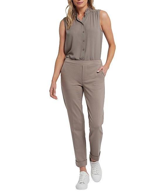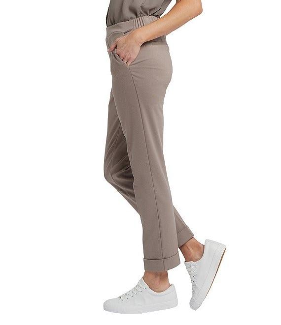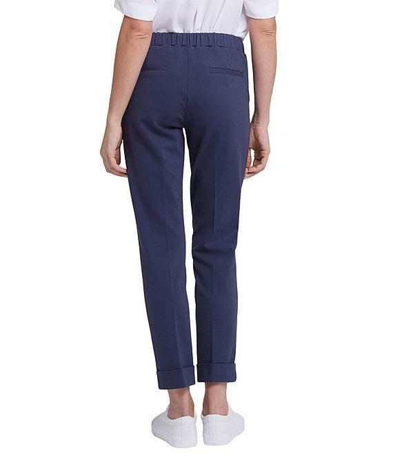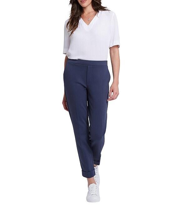 From NYDJ, these pants feature: Ponte knit fabrication Flat front silhouette Elasticized back waist Two front functional slant and two back welt pockets Faux fly detail Cuffed hem Leg creases Ankle length Pull-on construction Approx. 27" inseam, 10.5" front rise, 15.75" back rise Viscose/nylon/elastane Machine wash cold/line dry Imported.