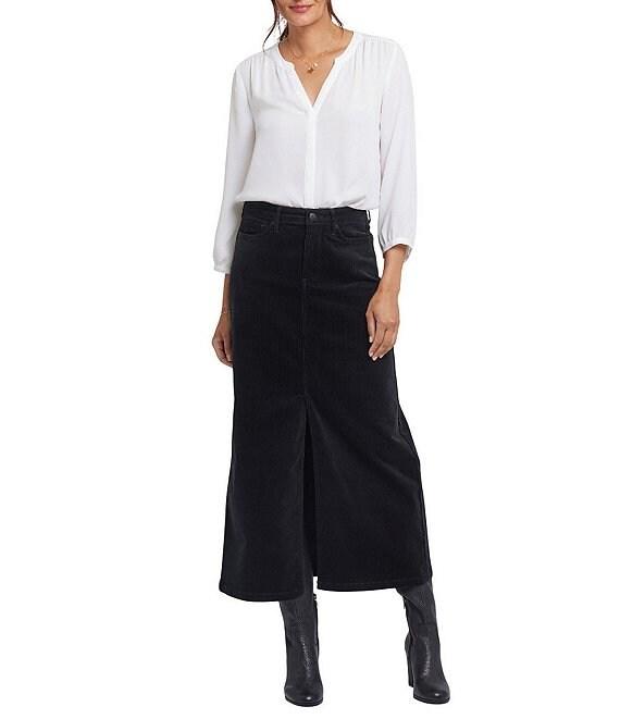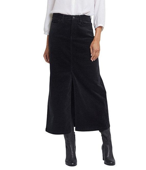 From NYDJ, this skirt features: Fine wale corduroy fabrication; softer feel than typical corduroy A-line silhouette High-rise waistline Front slit 5-pocket styling Lift Tuck® Technology provides just the right amount of support for a smooth, flawless figure; innovative, proprietary slimming panel with a patented criss-cross design Zipper fly and button closure; center-front Approx. 36" length Cotton/elastane Machine wash cold and line dry Imported.