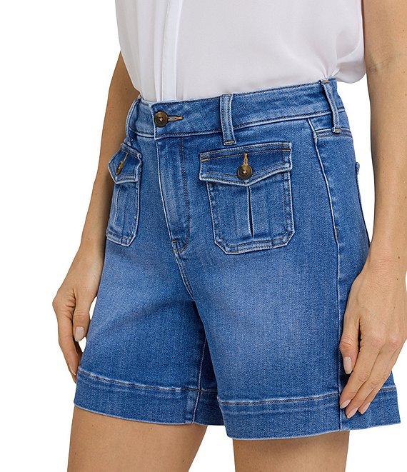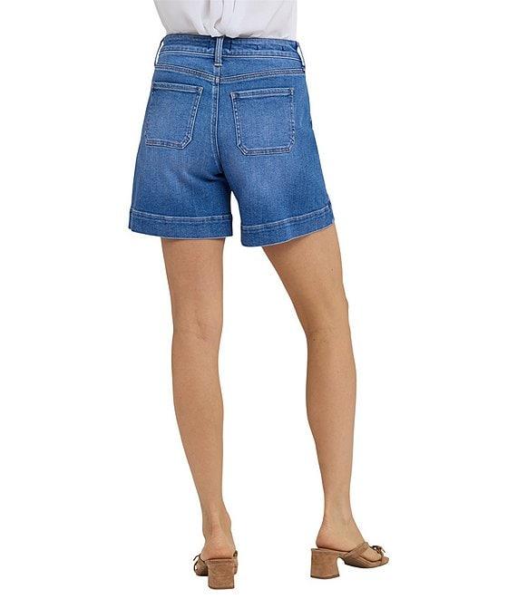 From NYDJ, these shorts feature: Denim fabrication Lift Tuck® technology High rise Belt loops uses a proprietary slimming panel with a patented criss-cross design to shape and support Button welt and back patch functional pockets Vertical seaming front and back darts Front button and zipper closure Approx. 9" inseam, 19" leg opening, front rise:11", back rise: 16.25" Cotton/elastane Machine wash Imported.