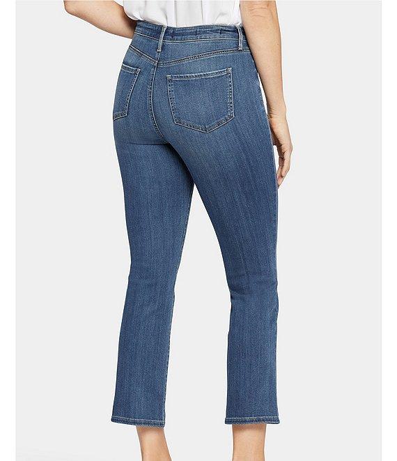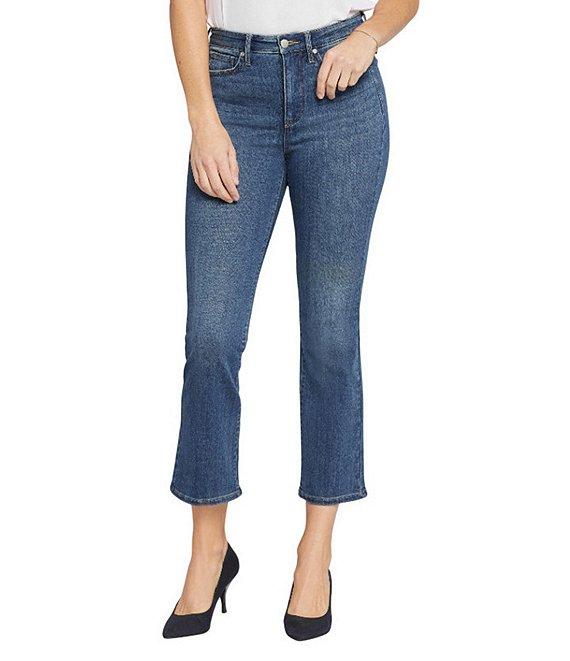 From NYDJ, these jeans feature:Stretch denim fabricationflared silhouetteHigh rise waistbandBelt loops 5-pocket style Cropped lengthLift tuck technologySlim fit Button and zip fly closure Approx. 27 inseam; 16.5 leg opening; Approx. 10.75 front rise; 15.75 back riseCotton/viscose/modal/polyester/elastaneMachine wash/line dryImported.