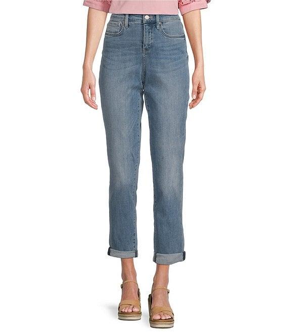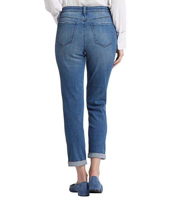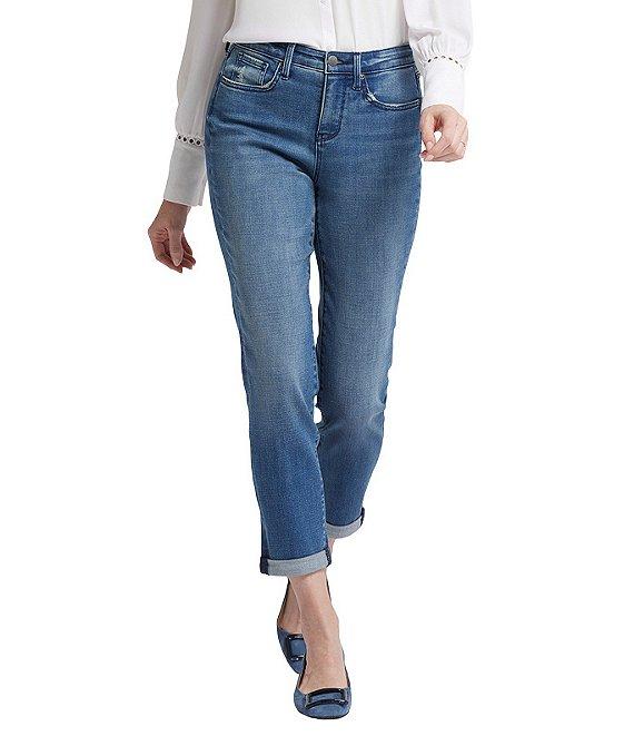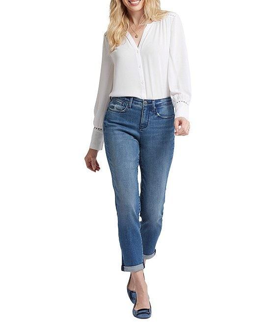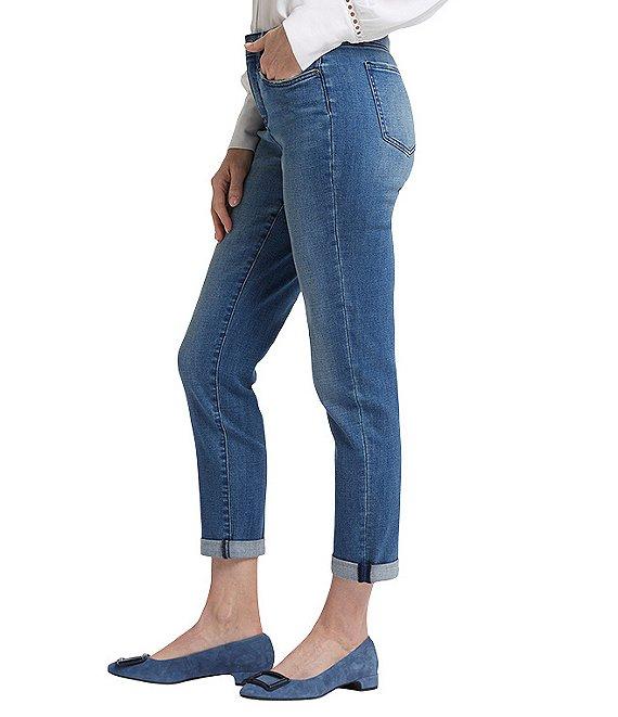 From NYDJ, these jeans feature:Stretch denim fabricationSkinny leg silhouetteMid rise Belt loops 5 pocket styleLift Tuck® TechnologyRelaxed fitCropped lengthFront button and zipper closureApprox. 26.5" inseam rolled, unrolled : 29", leg opening 13.5"Approx. 10" front rise: 15.5" back riseCotton/polyester/viscose/elastaneMachine wash Imported.