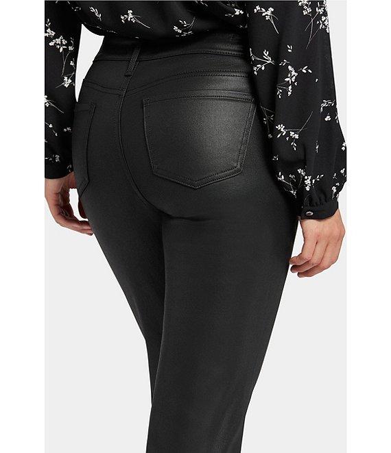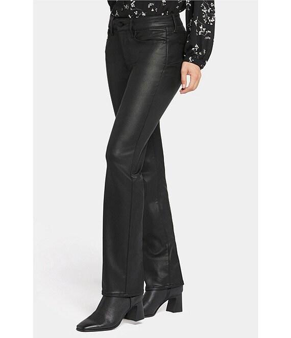 From NYDJ, this jeans features: Coated denim fabrication Straight leg silhouette Mid rise waistband Belt loops 5-pocket style Button and zip closure Approx. 32" inseam; 9.75" front rise; 15.25" back rise; 16" leg opening Modal/polyester/lycra elastane Machine wash/line dry Imported.