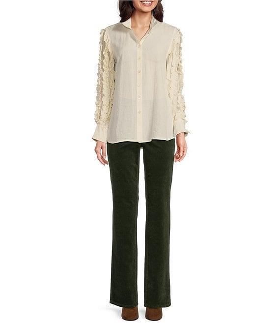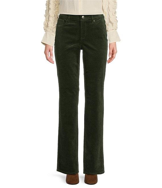 From NYDJ, these jeans feature: Fine wale corduroy fabrication Mid rise Straight leg Lift tuck technology 5-pocket style Belt loops Button/zip fly construction Approx. 32" inseam; 16" leg opening; approx. 9.75" front rise; 15.25" back rise Cotton/elastane Machine wash/line dry Imported.