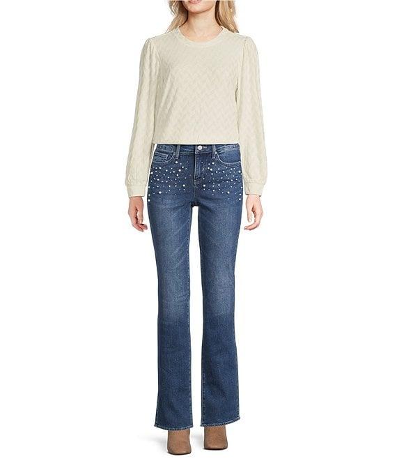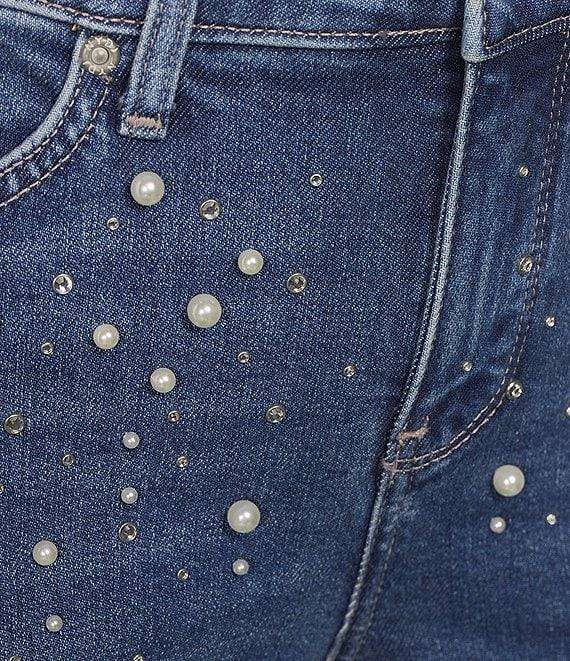 From NYDJ, these jeans feature: Stretch denim fabrication Straight leg silhouette Belt loops 5 pocket style Lift Tuck technology Faux pearls and rhinestones embellishments Ankle length Front button and zipper closure Approx. 32" inseam, front rise: 9.75", leg opening: 16" Cotton/elastane Machine wash cold/line dry Imported.