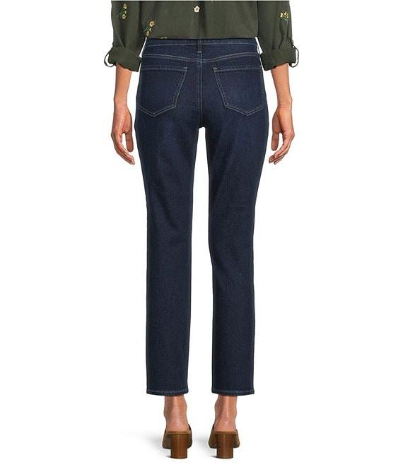 From NYDJ, these jeans feature: Denim fabrication Flat front silhouette Belt loops 2 Front slash and 2 back patch functional pockets Lift tuck technology Front seam Rolled cuff Ankle length Front button and zipper closure Approx. 29"inseam, 10" front rise Cotton/elastane Machine was cold/line dry Imported.