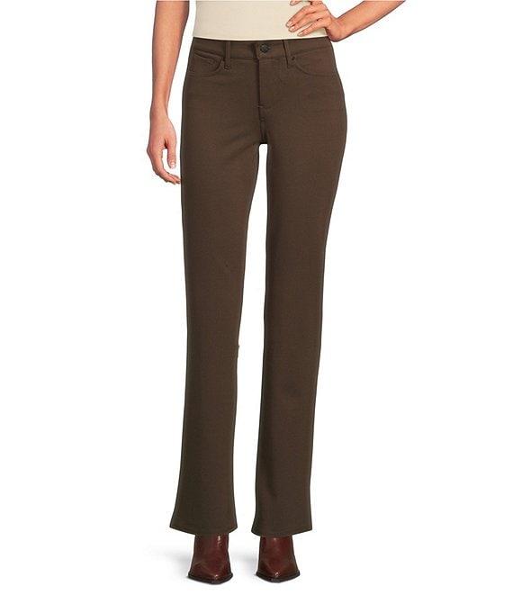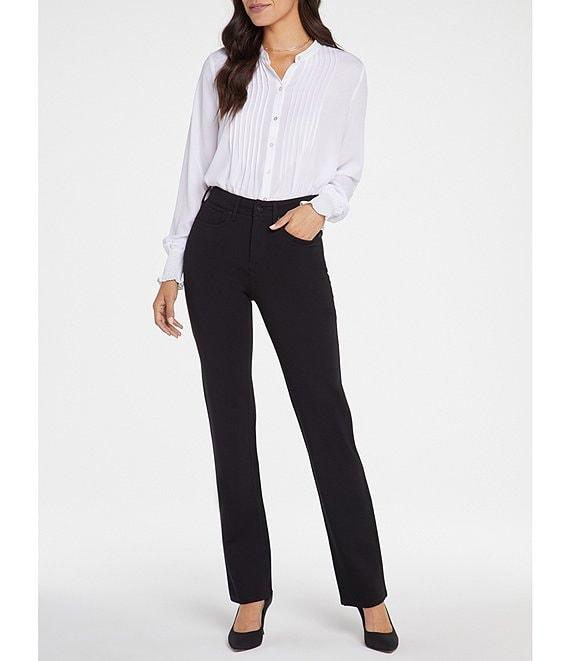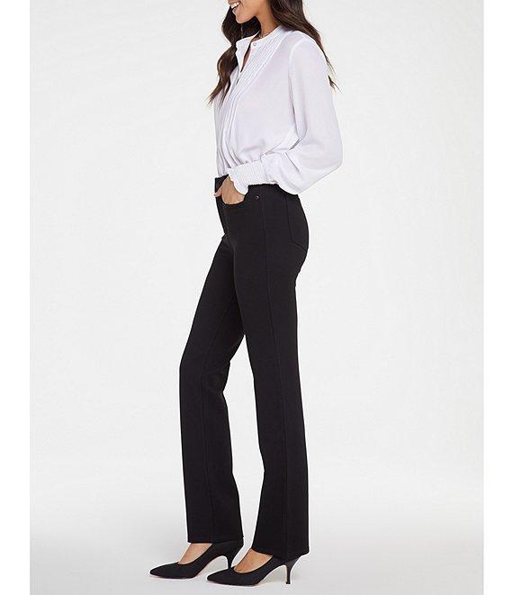 From NYDJ, these pants feature: Stretch ponte fabrication Straight leg Belt loops 5-pocket style Button/zip fly closure Approx. 32" inseam; 16" leg opening; 9.75" front rise; 15.25" back rise Viscose/nylon/elastane Machine wash Imported.
