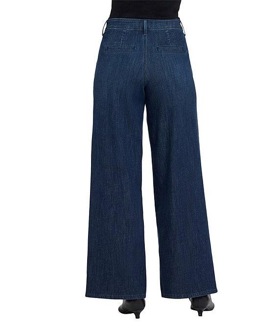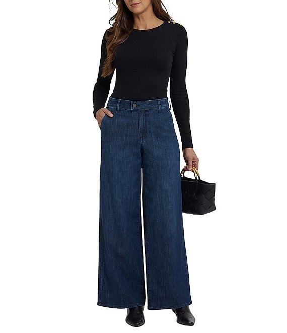 From NYDJ Petite, these jeans feature: Stretch denim fabrication Wide-leg trouser silhouette High-rise waistline Belt loops Front slash pockets Back welt pockets Straight hemline Zip fly with button-tab waist Approx. 28" inseam; 24.5" leg opening Cotton/Tencel™ Lyocell/polyester/elastane Machine wash Imported.