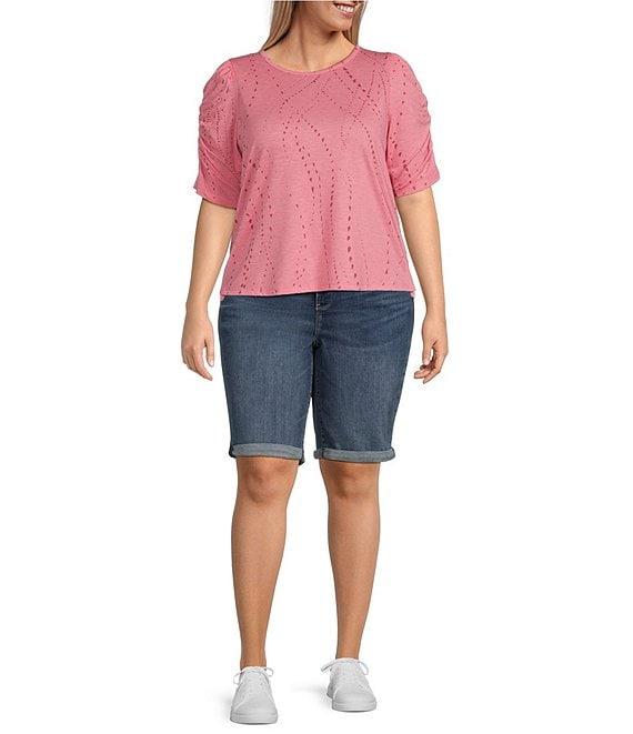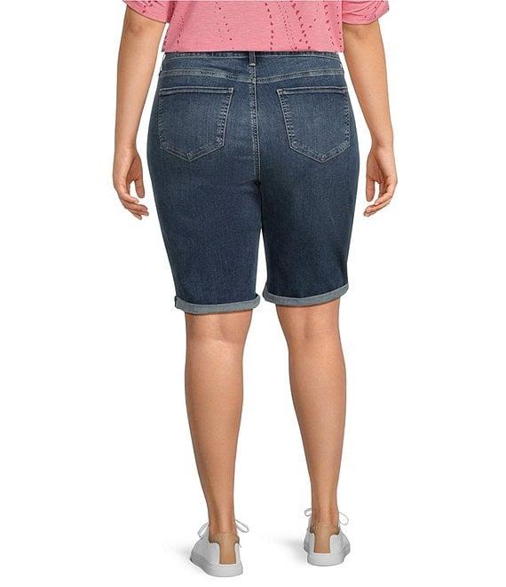 From NYDJ Plus, this short features: Stretch denim fabrication Mid rise waistline Five pocket styling Lift Tuck® Technology Roll cuffs Front button/zipper fly closure Approx. 11" inseam; 22" leg opening, 12.25" front rise, 19.25" back rise Cotton/polyester/elastane Machine wash/line dry Imported.