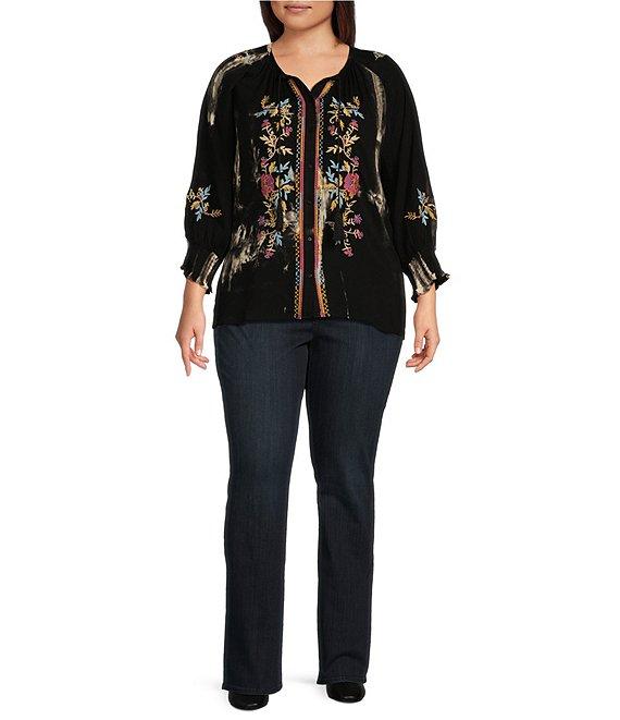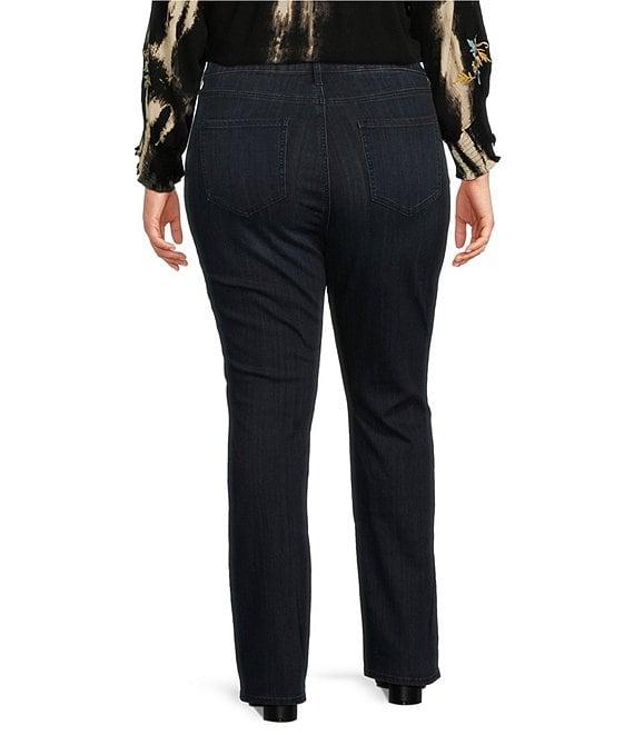 From NYDJ Plus, these jeans feature: Sure stretch denim fabrication Slim bootleg silhouette High Rise Belt loops 5-pocket style Button/zip fly closure Approx. 32" inseam; 18" leg opening; 12.75" front rise, 19.5" back rise Cotton/viscose/modal/polyester/elastane Machine wash/tumble dry Imported.