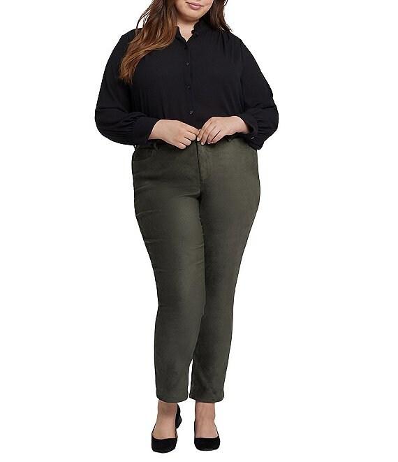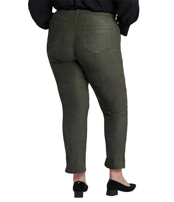 From NYDJ Plus, these jeans feature: Stretch faux suede fabrication Slim straight leg Lift tuck technology 5-pocket style Belt loops Lift Tuck Technology, which flattens and flatters using a proprietary slimming panel with a patented criss-cross design Button/zip fly closure Approx. 30" inseam; 11.5" back rise; 21.5" leg opening Polyester/elastane Machine washable Imported. Prepare yourself for more than a few admiring stares. NYDJ s Sheri Slim Jeans in Plus Size in Stretch Faux Suede feature an expertly cut fit that s always in season. Enhance your assets and streamline your silhouette with our signature Lift Tuck Technology, which flattens and flatters using a proprietary slimming panel with a patented criss-cross design.