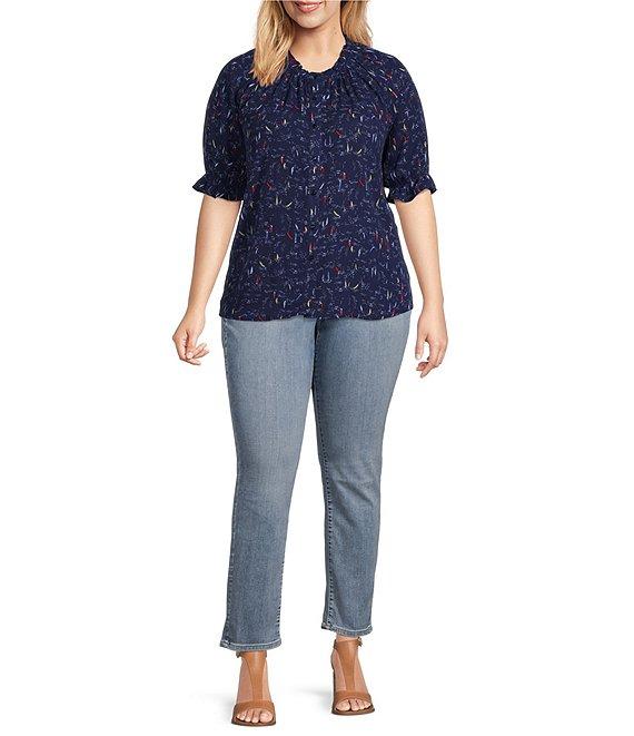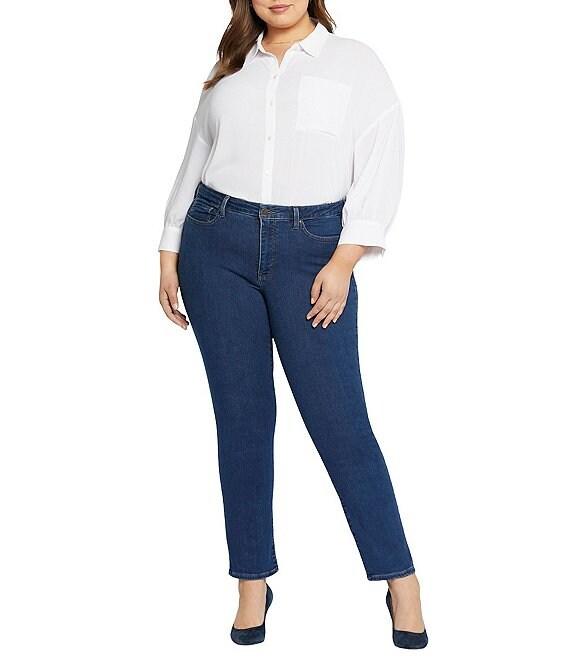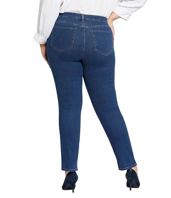 From NYDJ Plus, these jeans feature: slim leg silhouette high rise waistband belt loops 5-pocket styling tonal stitch detail straight hemline front button/zip fly closure approx. 30" inseam cotton/polyester/lyocell/elastomultiester/elastane machine wash/line dry Made in the USA. NYDJ is the original slimming jean, designed with a superior fit that makes women look and feel amazing. We use premium denim with just the right amount of stretch — for comfort with no bagging — even between washings. Our Lift Tuck Technology® gives you gentle control in front while lifting and shaping in back. NYDJ offers all of this while adding something else as well...STYLE!