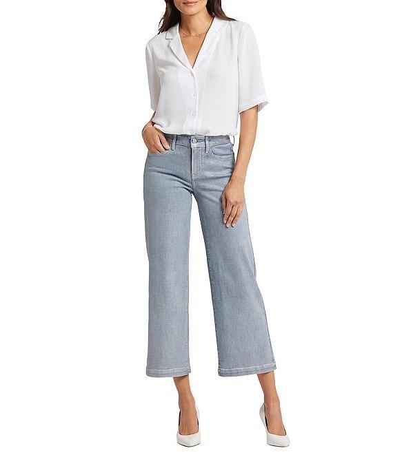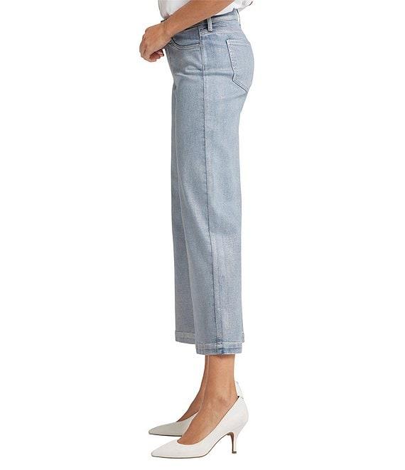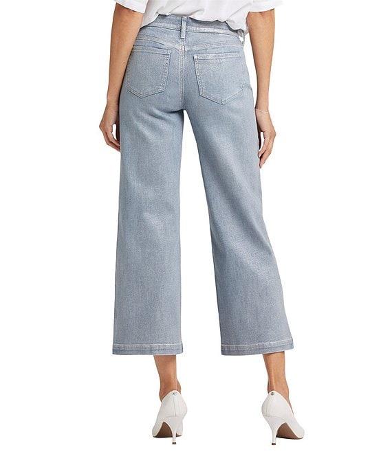 From NYDJ, these jeans feature: Stretch denim fabrication Wide leg silhouette Silver foil coating Belt loops 5 pocket style Lift Tuck® technology Ankle length Front button and zipper closure Approx. 27" inseam, 22" leg opening, 9.75" rise Cotton/lycra/elastane Machine wash Imported.