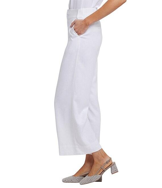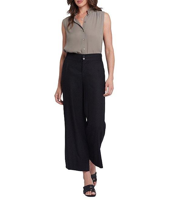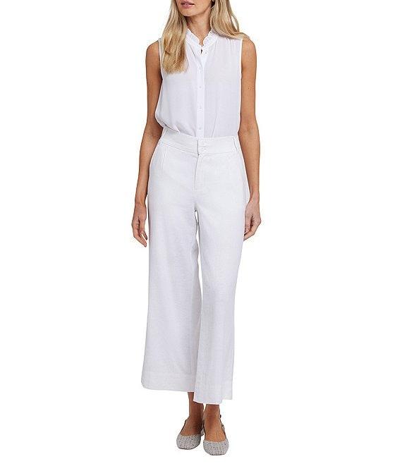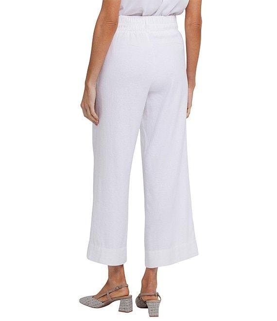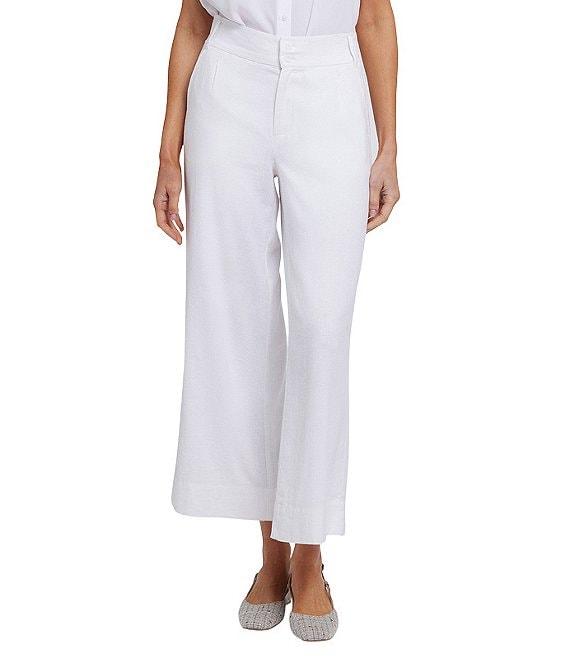 From NYDJ, these pants feature: Stretch linen blend fabrication Wide leg silhouette Belt loops High rise 4 pocket styling Cropped length Front button and zipper closure Approx. 27" inseam, 25" leg opening, front rise 11", back rise 17" Linen/viscose/elastane Machine wash Imported.