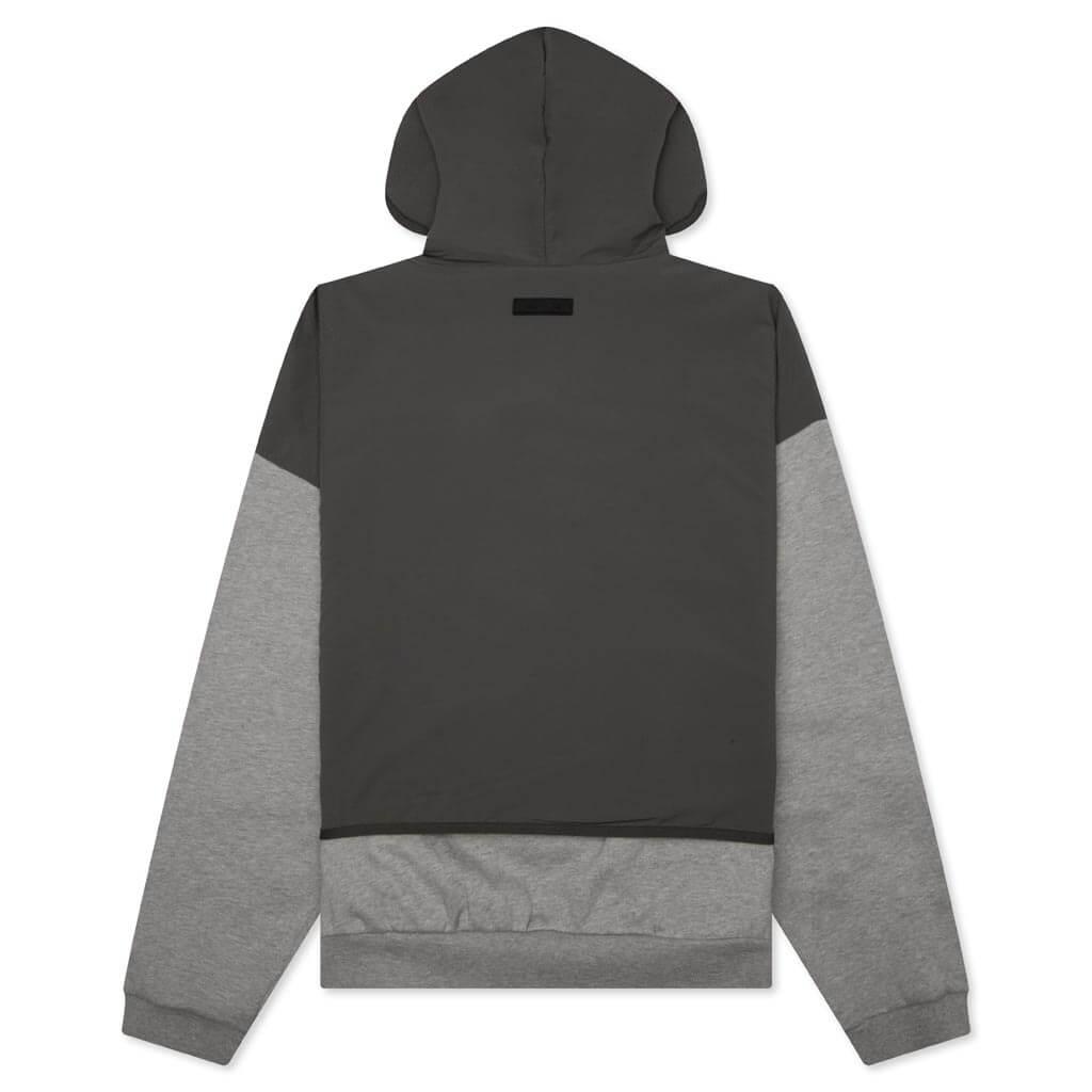 A new style inspired by the layered looks of the 90s, the Fear of God Essentials Nylon Fleece Hooded Sweater is made from core fleece and covered with a stretch nylon shell. The piece is designed with volume to create a round, cropped silhouette. Details include a mock neckline, side seam pockets, rib-knit cuffs, and waist hem. A collegiate-inspired Essentials Fear of God logo on the center front is made modern in a rubberized soft-touch texture. A Fear of God rubberized label is at the back collar to complete the design. ALL SALES ARE FINAL. THIS GARMENT HAS AN OVERSIZED FIT; IT IS RECOMMENDED TO SIZE DOWN FOR A TRUE-TO-SIZE FIT. 80% Cotton/20% Polyester Heavyweight fleece Spandex shell Relaxed fit Side seam pockets Mock neckline Ribbed cuffs Rubberized labels Style No: 202SP244323F