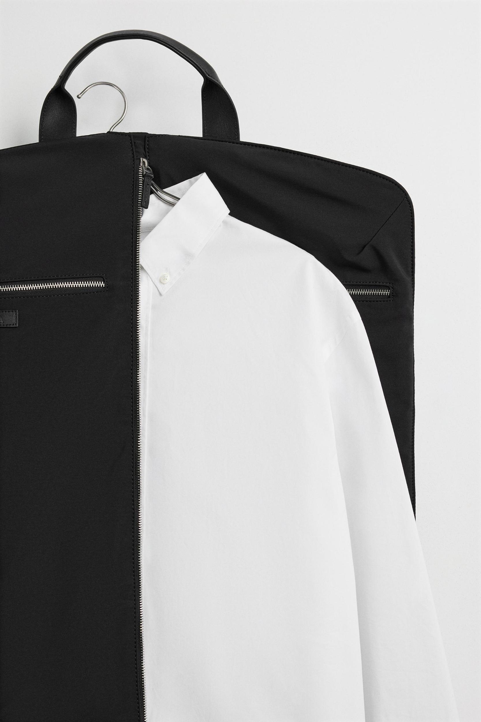 Garment bag made in technical fabric. Main compartment with zipper closure. It has two auxiliary pockets with zipper closure. Leather handles. Height x Length x Width: 22.8 x 18.9 x 1.2 inches (58 x 48 x 3 cm)