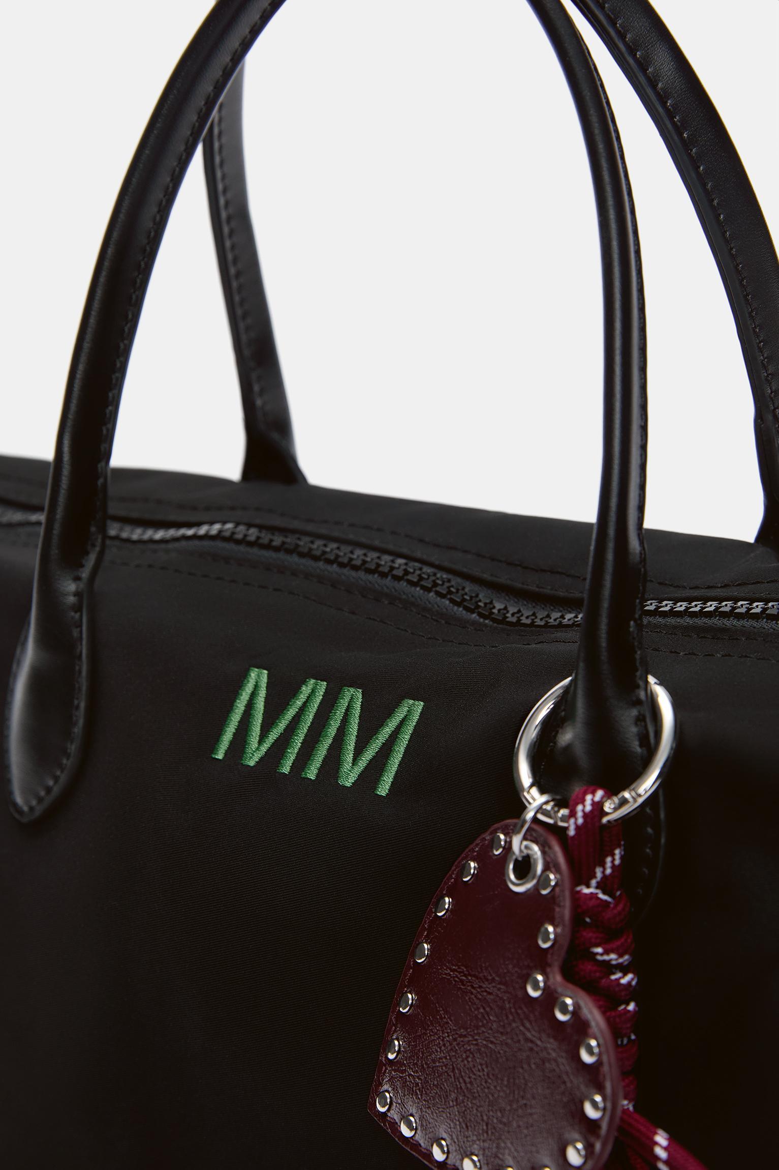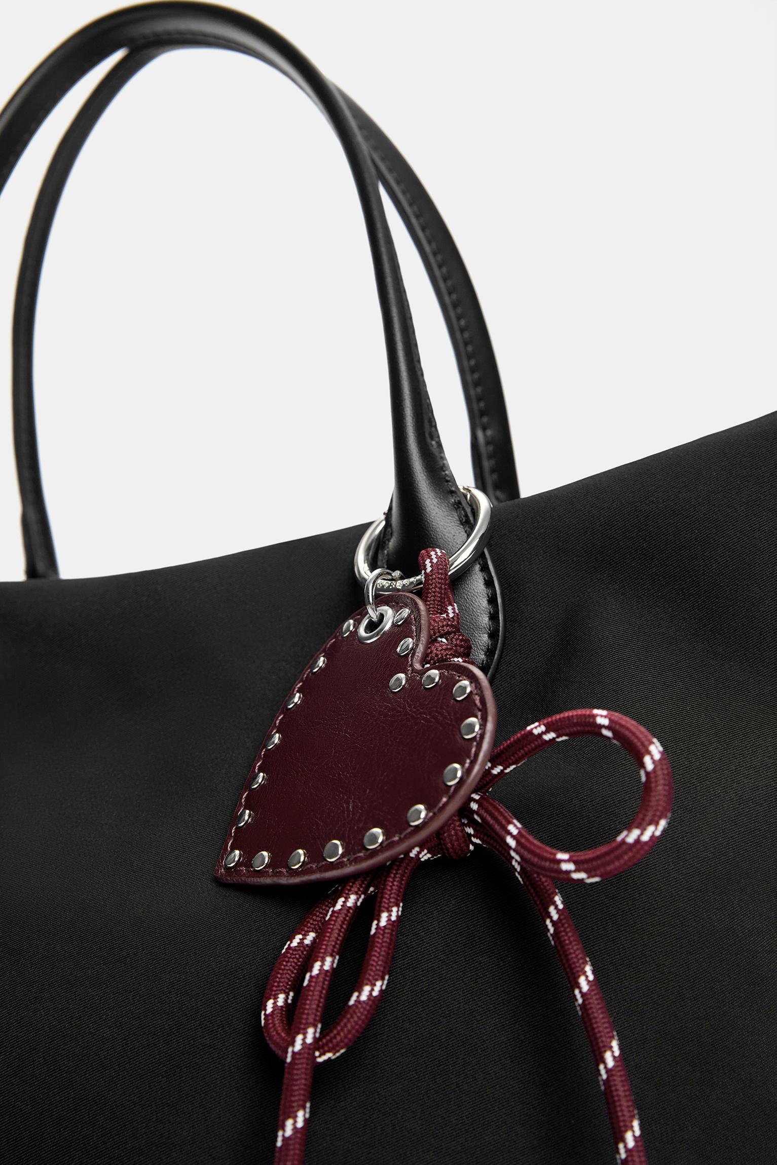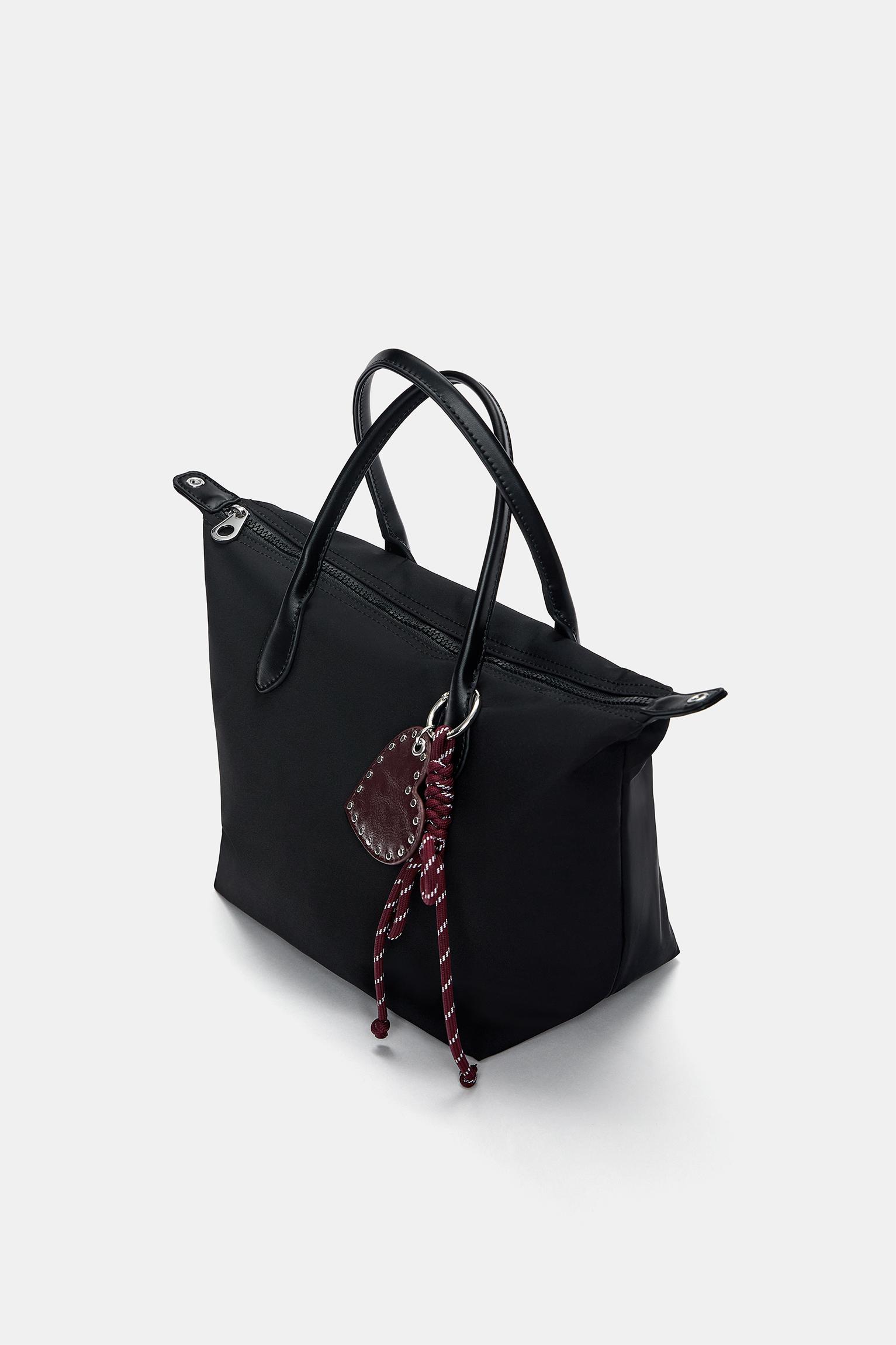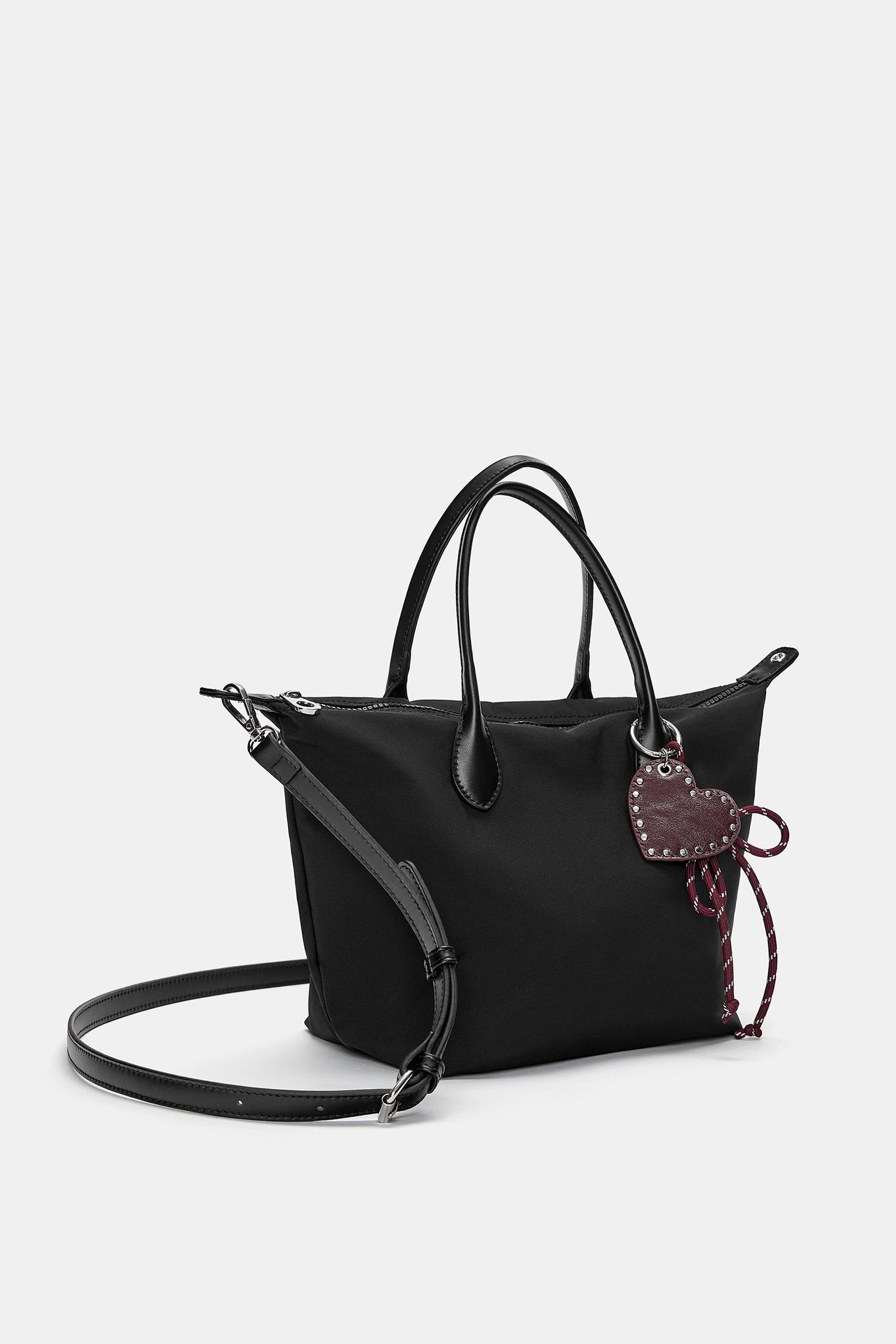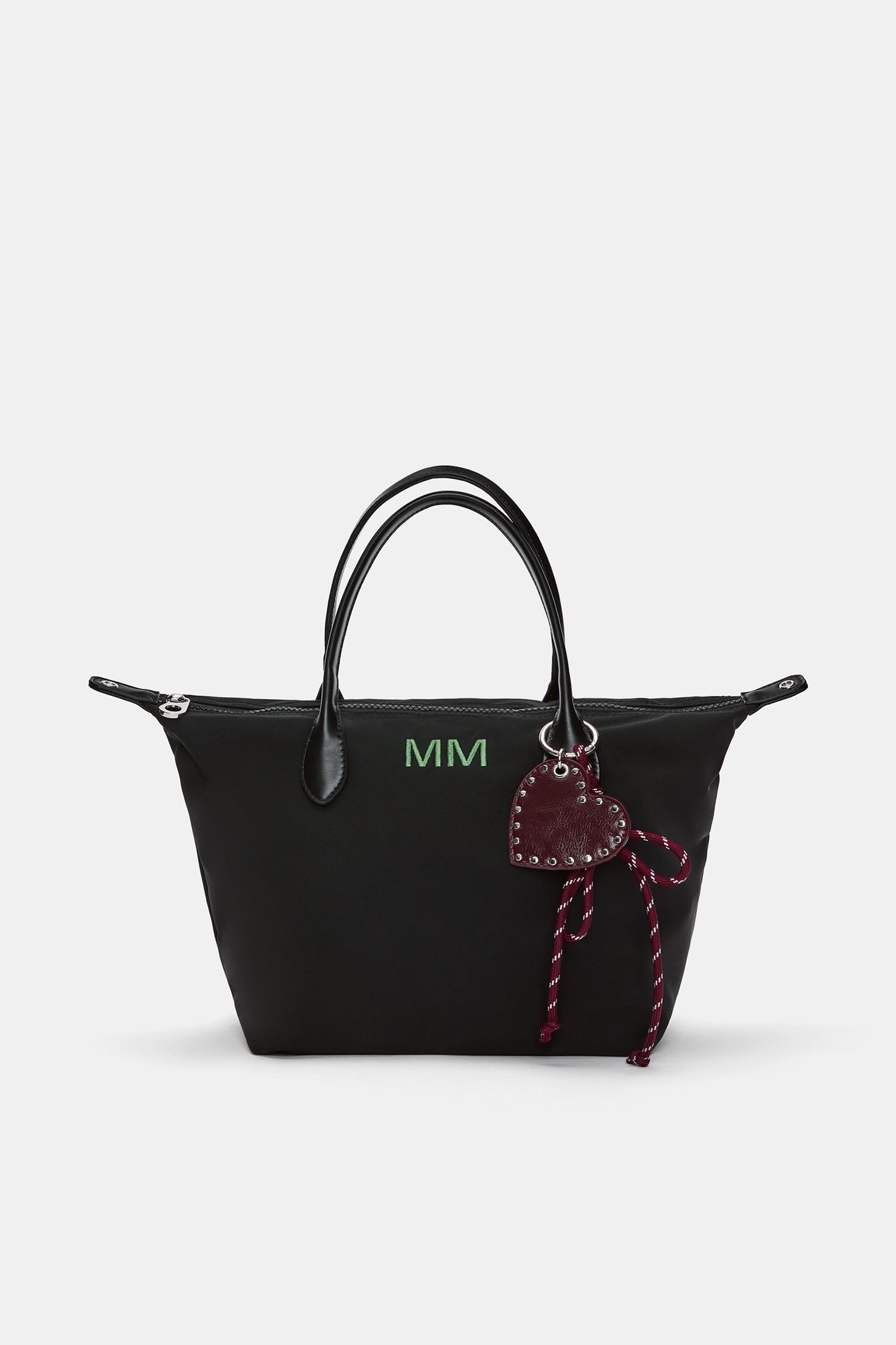Nylon-style shopper bag. Available in assorted colors. Heart charm detail. Short handles and long detachable strap. Zipper closure. Height x Length x Width: 22 x 35 x 15 cm.
