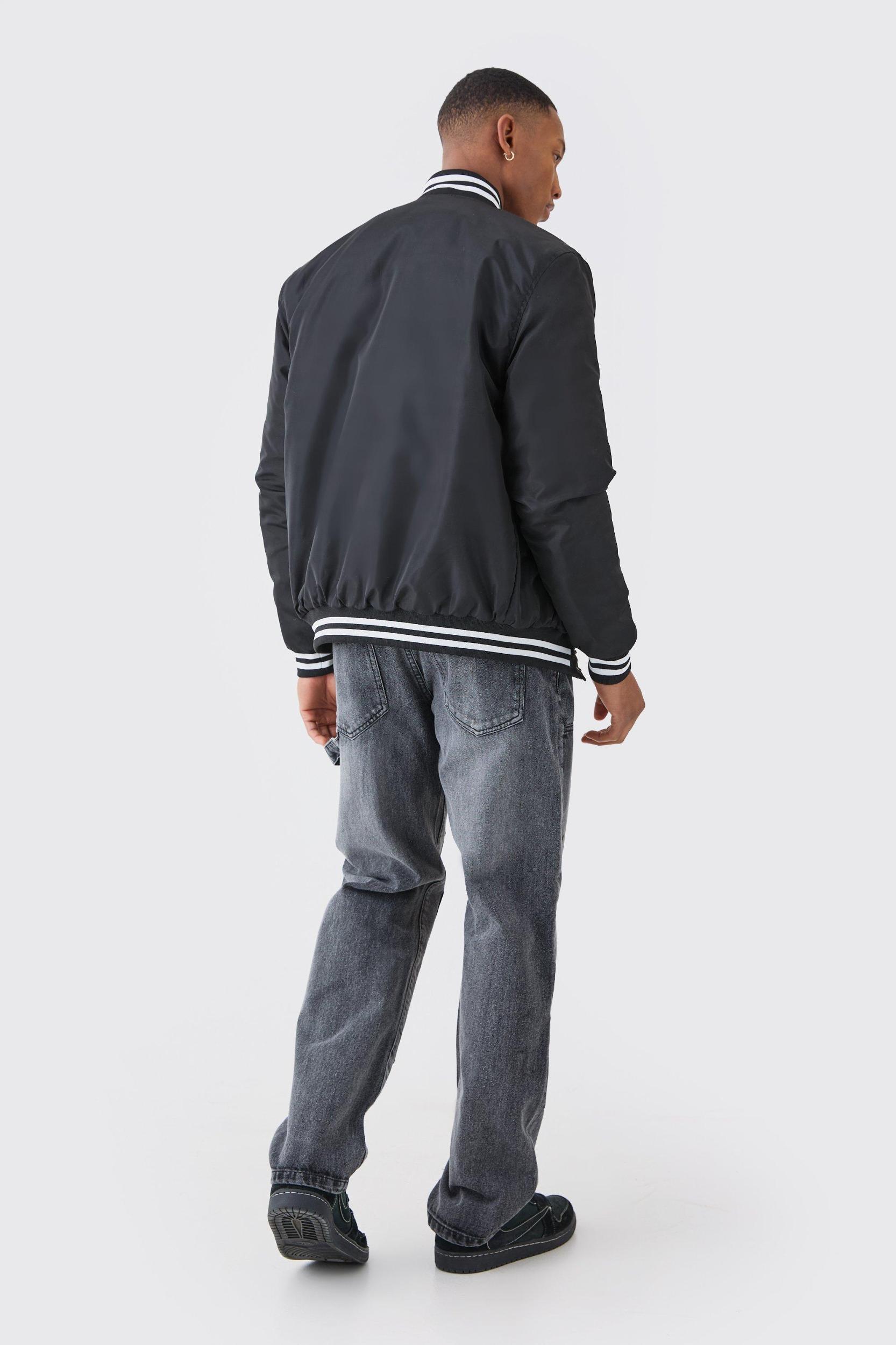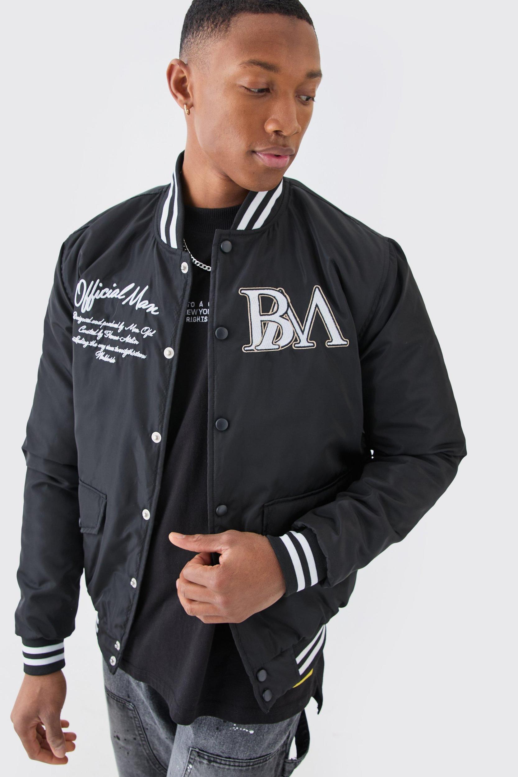 Mens Black Nylon Varsity Jacket With Badges - Keep out the chill while looking slick in a boohooMAN coat. Rev up your outerwear inventory this season with our unrivalled collection of coats and jackets for men. Whether youre looking for a heavy coat to combat the low temperatures, or a lightweight jacket to stand out while having fun at your favourite festival, weve got the trendiest designs to finish off your outfit with. Puffers, parkas and borg jackets are the perfect choices if you want to bundle up without sacrificing on style, and they look great when teamed up with chunky knitwear, denim and boots. Bombers and overcoats are beyond versatile and can turn any getup from laid-back to dapper in no time. Denim and Harrington jackets cant be missing in your trans-seasonal wardrobe, while cagoules and coach jackets will keep out the chill while youre out and about.Style: Varsity JacketDesign: VarsityFabric: PolyesterLength: RegularNeckline: Bomber NeckSleeve Length: Long Sleeve