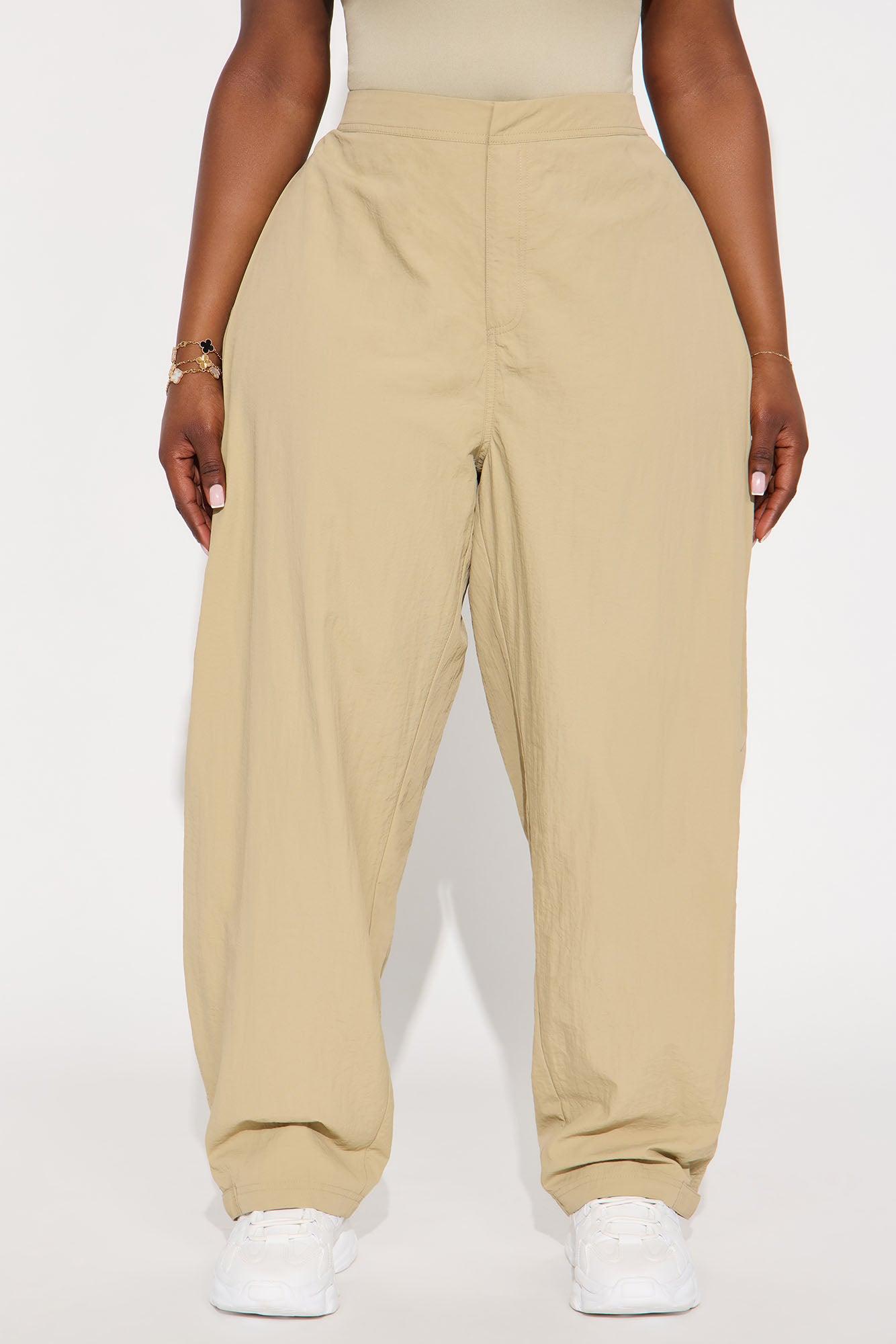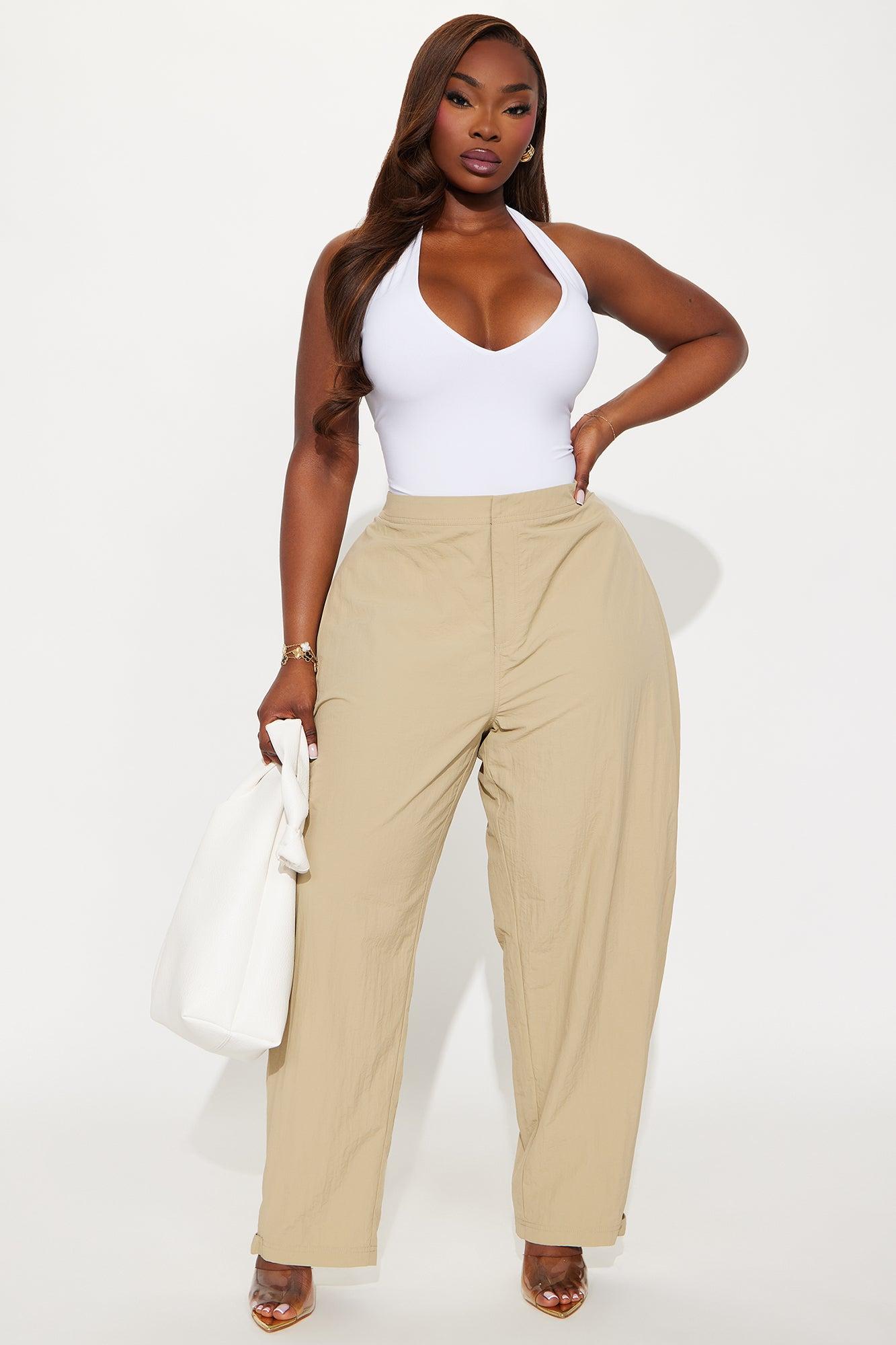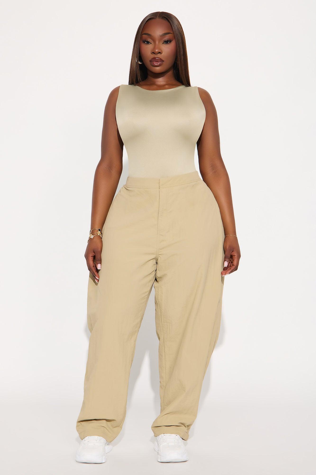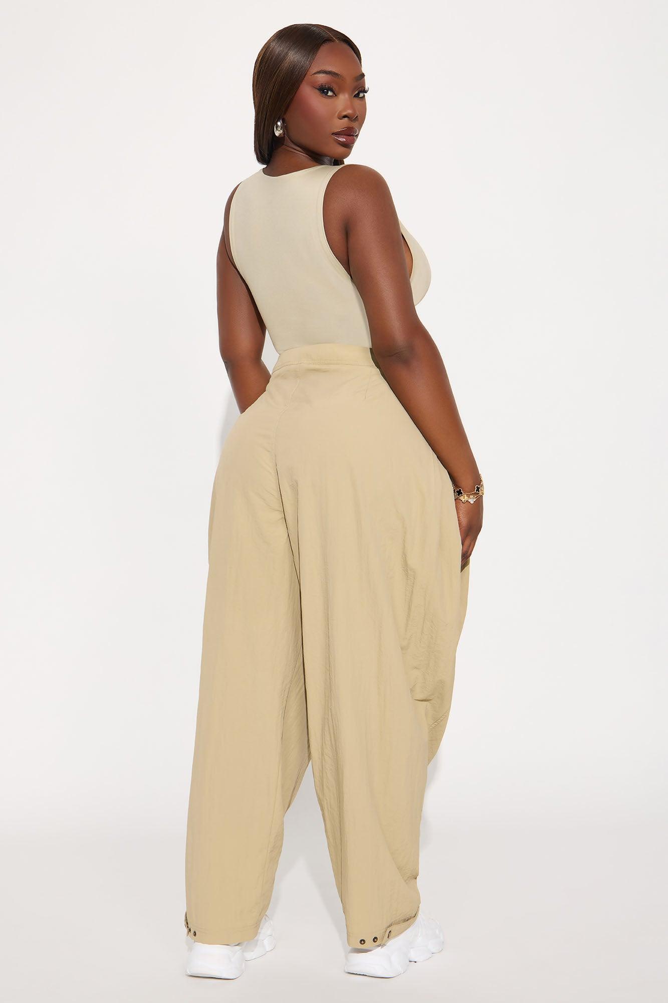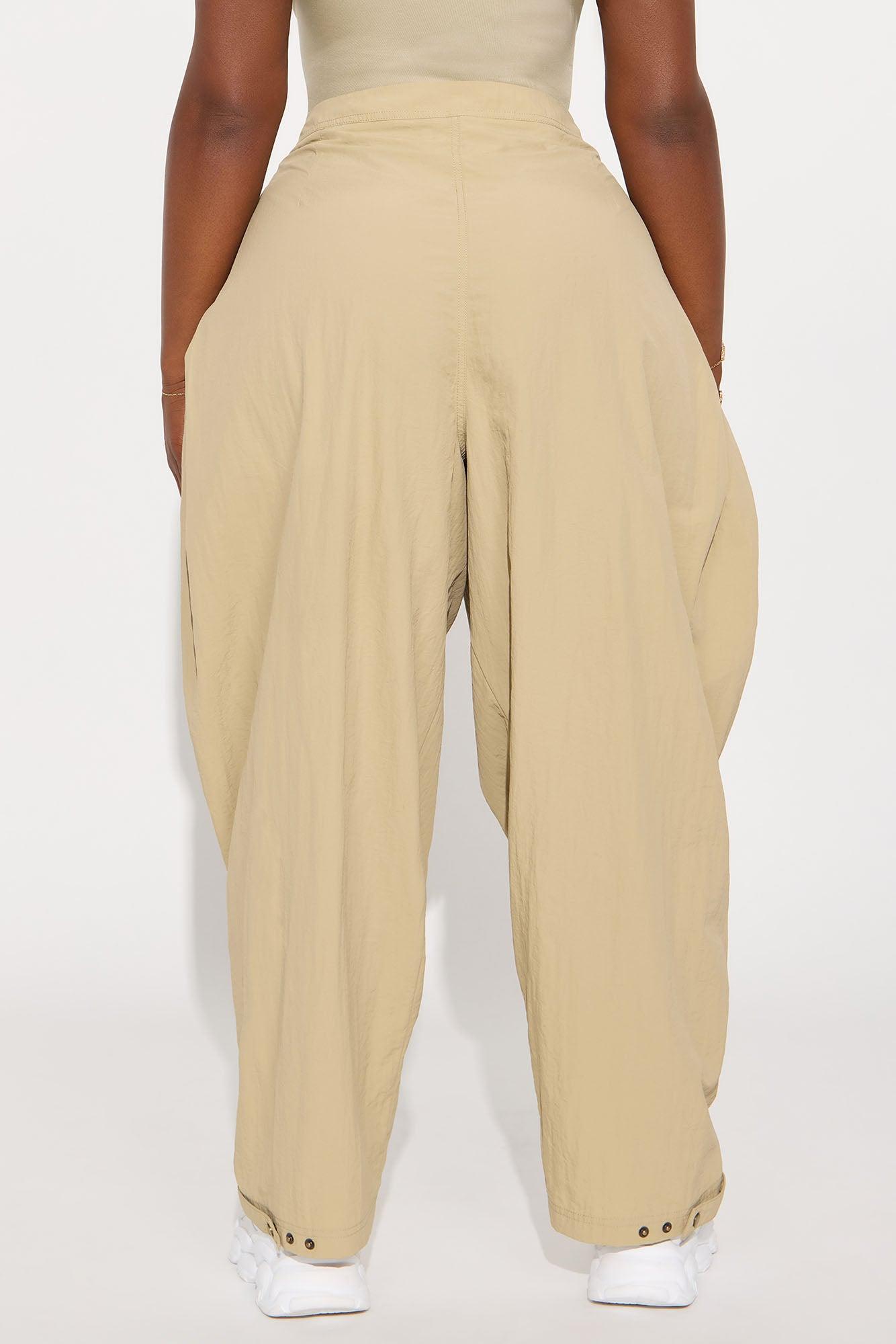 Available In Black, Olive, Sage and Khaki Windbreaker Pants Non Stretch Low Rise Button & Zip Closure Hand Pockets Ruched Side Wide Leg Snap Button Ankle Detail Self: 100% Nylon Imported California Proposition 65WARNING: Cancer and Reproductive Harm - www.P65Warnings.ca.gov.