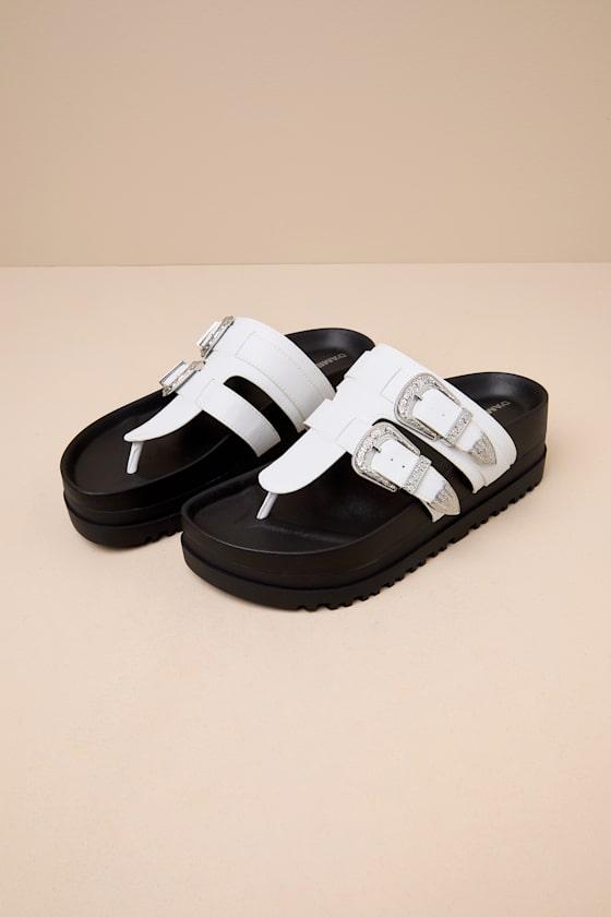 Pair your fave capris with the D'Amelio Footwear Nyra Bright White Faux Leather Thong Buckle Flatform Sandals and everyone will be asking where you shop! These iconic sandals have an almond-shaped footbed and a smooth faux leather fabrication that forms a thong-style upper with a strappy design and adjustable, silver Western-embossed buckles at the outstep. 1" lug sole rises to a chunky 2.5" heel with a smooth contoured insole.