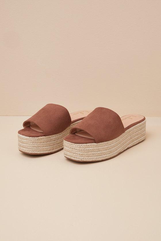 Kick up a good time in the Lulus O'Ahu 2 Cocoa Brown Suede Espadrille Platforms! These cute sandals have a soft, faux suede construction that shapes a wide toe strap atop an almond-toe footbed. Simple slide-on silhouette and 1.75" toe platform complete the look!