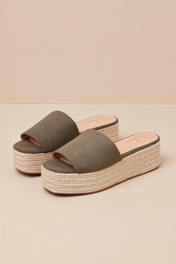 Kick up a good time in the Lulus O'Ahu 2 Green Suede Espadrille Platforms! These cute sandals have a soft, faux suede construction that shapes a wide toe strap atop an almond-toe footbed. Simple slide-on silhouette and an espadrille-wrapped platform complete the look!