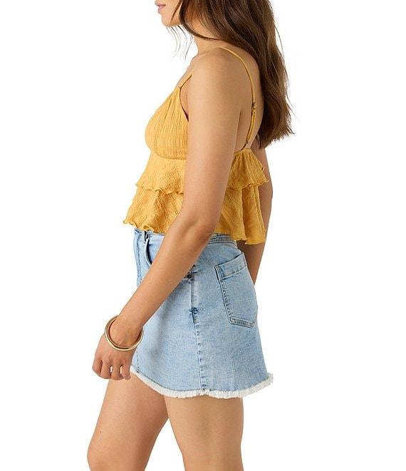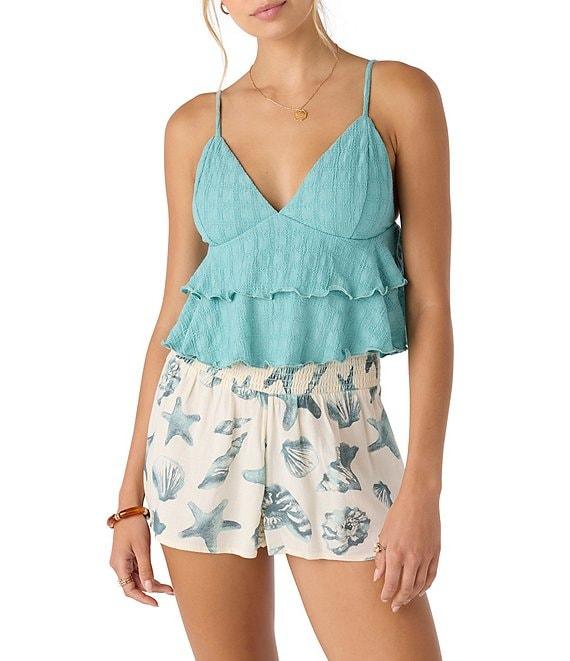 From O'Neill, this tank top features: Flowy style V-neckline Sleeveless styling Lined bodice Spaghetti straps with metal strap adjusters Tiered peplum hem Pullover styling Cropped length Polyester/elastane textured knit Machine wash/tumble dry Imported.